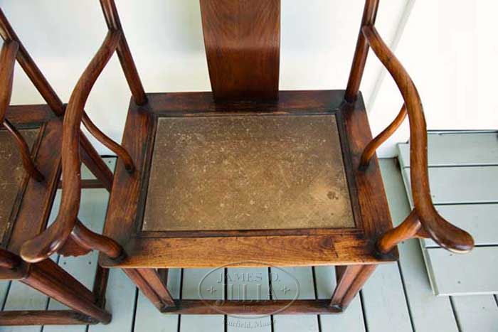 Please contact our office at 207-453-7125 or email antiques@jamesdjulia.com. FINE & IMPORTANT PAIR OF HUANGHUALI YOKEBACK ARMCHAIRS (GUANMAO YE). Chinese, late 17th, early 18th century. Each arched crestrail with sloping neckrest continuing to boldly backswept projecting ends supported on gently curving stiles centering the conforming undulating splat carved with a vine and cloud image within a shaped medallion. The outscrolled arms joined to tapering medial supports, the front supports similarly shaped and with lobed spandrels, centering the rectangular seat fitted with a soft mat within a molded frame. Seat frame with square molded edge raised on cylindrical legs each set with molded square apron, the front apron with molded scalloped edge. All joined by a shaped box stretcher, each side with aprons, the front forming a flattened foot rest. Note: These armchairs were the most prestigious of household seating furniture. The type, known as guanmao ye or “official’s hat chair”, refers to the resemblance of the crestrail to the extended wings of an official’s cap. SIZE: 46″ h x 24-1/4″ w x 22″ d. 20-1/2″ h of seat. PROVENANCE: From the Richard B. Hobart Collection. Purchased in 1921 in Beijing by Janet E. Hobart (see photo). Pair of chairs have remained in the Hobart family ever since. Hobart Collection established the benchmark for the Chinese antiquities market in the United States at two famous sales conducted at Sotheby’s, New York December 12, 1969 and also in 1970. CONDITION: With exceptional deep warm honey red/brown tones and with accentuated graining. Rich undisturbed patina. Structurally overall very good. Note: one spandrel, beneath proper left arm of one chair is missing its lower section. 9-24287 (400,000-600,000)