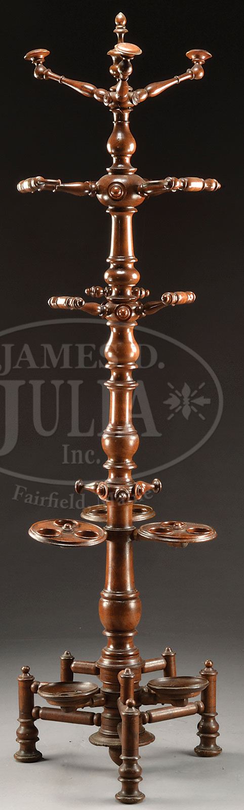 UNIQUE CARVED WALNUT HALL STAND. Third quarter 19th century. The baluster-turned shaft tapering to an urn-form finial fitted overall with tiers of T-form turned arms for coats, fitted with three circular trays, each with three cutouts above conforming dishes designed to accommodate umbrellas and walking sticks raised on turned cylindrical supports, each joined to the shaft by three cylindrical stretchers. SIZE: 7′. CONDITION: Original surfaces, professionally cleaned and polished. Repairs to one tray, otherwise very good and original. 9-90027 (1,000-2,000)