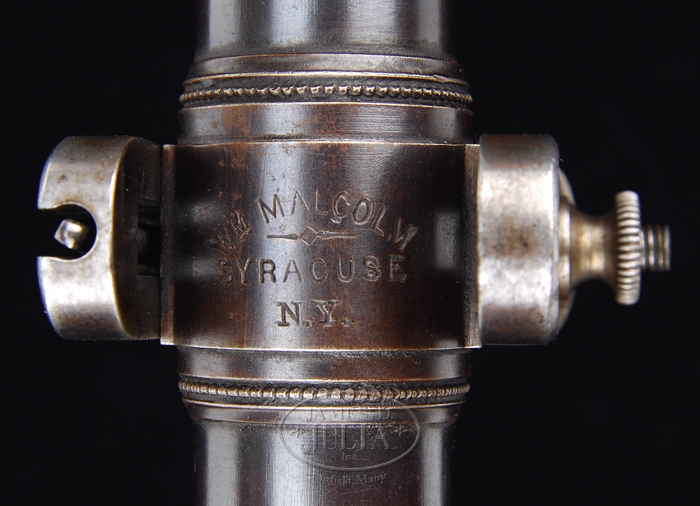 SCARCE MALCOLM TARGET SCOPE. Fine 34″ scope with 3/4″ tube and orig target mounts with windage adjustment in front and elevation in rear. It has usual “Malcolm” and “Syracuse, New York” markings and it has its orig rear dust cover, front missing. PROVENANCE: Glenn Marsh Collection. CONDITION: Very fine. Tube retains about 90% strong plum brown patina with cleaned spot about midpoint. Crosshairs are intact. Optics are fine. 4-59715 JR156 (1,500-2,500)