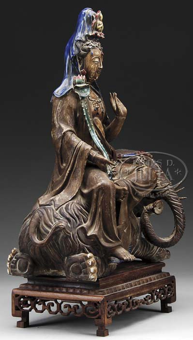STONEWARE GROUP OF SAMANTABHADRA ON HIS ELEPHANT. Chinese, late Qing Dynasty. Probably Yi Hsing ware. Nice example with enameled highlights featuring the bejeweled Buddha with deep indigo headdress and an enameled lotus stem and blossom astride a fanciful recumbent elephant with enameled trappings and six tusks. Together with a hardwood stand. SIZE: 19″ h x 16″ l. PROVENANCE: From the private collection of the grand-niece of the last Emperor Puyi of the Qing Dynasty and granddaughter of crown Prince Pujun. CONDITION: Very good with original surfaces. 9-23944 (7,000-10,000)