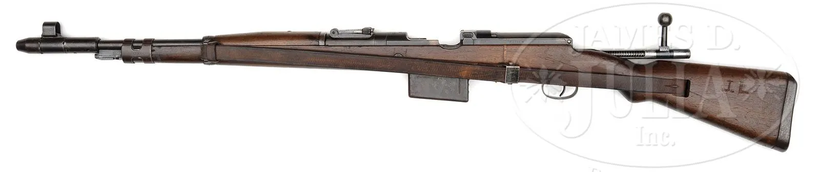 *◊ MAUSER 8MM G41(M) RIFLE. SN 1105. Scarce early Mauser G41(M) Rifle produced 1942 with early pattern machined trigger guard. WaA 135 proofed on all major parts and stock. All SN’s match to include stock and bolt group. Bore is very good. Orig matching walnut stock with the initials “J.L” scratched into the butt. Authentic wartime sling and authentic front sight hood. Overall correct and solid example of an veteran bring-back early production G41(M). PROVENANCE: Collection of Dr. Geoffrey Sturgess. CONDITION: Good to very good. Metal retains 85-90% of orig bluing with some browning occasionally. Stock has been repaired (duffel cut). Missing two locking screws on trigger guard. 4-53230 DW2 (7,500-10,500)