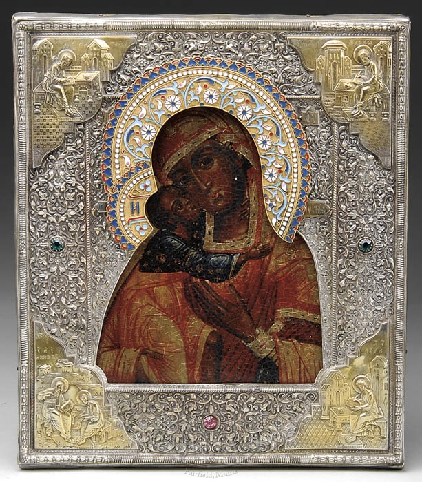RUSSIAN SILVER AND ENAMELED FRAMED ICON. The wood painted icon of Madonna and child encased in a silver fancy frame having an enameled halo, Russian writing and colored rhinestones. The frame marked “H.A 1861 MIII”. Probably 20th Century. SIZE: 12-1/2″ x 10-1/2″. PROVENANCE: From a large Boston, MA area Estate. CONDITION: Craquelure to painting, otherwise very good. 9-99350 (500-1,000)