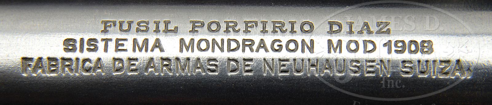 *◊ UNIQUE SIG 7.5 MM PROTOTYPE MONDRAGON M1907 SL RIFLE. SN 2. Cal. 7.5 mm. Exceptional Swiss prototype of Mexican M1907 Mondragon Rifle in 7.5mm Swiss Caliber FOR Swiss Army tests. Ex-Henk Visser collection, ex-SIG factory collection. Bolt and receiver marked “2” with Swiss SIG factory “hammer” proofs, Mexican crest and “FUSIL PORFIRIO DIAZ SISTEMA MONDRAGON MODEL 1908 FABRICA DE ARMAS DE NEUHAUSEN A SUIZA”. Bore is excellent. Trigger assembly is numbered “56”. Comes with exceedingly rare factory fitted bipod. Additionally, includes an excellent condition and exceptionally rare Swiss-made Mexican shovel bayonet marked “HIERRO” (iron)to one blade, “MADERA” (wood) to the other and REPUBLICA MEXICANA”. Once in a lifetime opportunity to obtain this unique Mondragon prototype with accessories. PROVENANCE: Collection of Dr. Geoffrey Sturgess, ex-Visser and SIG factory collections. CONDITION: Excellent. Overall condition of bolt and receiver is excellent retaining 98% of bluing. Stock has few scattered handling marks and scratches. 4-53244 DW15 (25,000-35,000)