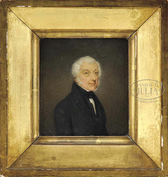 ADAM BUCK (British, 1759-1833) MINIATURE PORTRAIT OF A GENTLEMAN. Pencil signed “Adam Buck 1831”. The unidentified half portrait showing a man wearing a black coat, black vest and white shirt. He has white hair with white sideburns. Housed in its original lemon gold period frame. The back having an original label “J. Benson Carver Guilder”. Also on reverse is a round sticker “K.E. Houston Collection”. SIZE: Total: 5-3/4″ x 5″. CONDITION: Very good. 9-22284 (1,000-2,000)