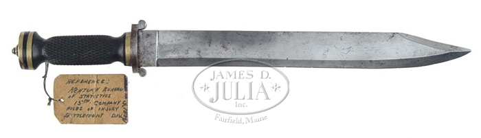 CIVIL WAR ERA BOWIE KNIFE PURPORTED TO HAVE BELONGED TO A CONFEDERATE SOLDIER. 11-3/4” clip point bowie with well made ricasso. 16-5/16” overall. Has small iron cross guard with 2 quillons cast such that they cover edges of blade. Every surface of the blade, which is ¼” thick at the back, the flats, the edges, and false edges, is skillfully hollow ground suggesting surgical instrument maker’s work. Grip is checkered ebony with brass ferrule at cross guard and pommel. Pommel is flat, ovoid, and has umbrella shaped cap stand. Most likely, the unmarked knife, dating to the mid 19th C, was American made though there is a slight possibility of being from London or Scotland. Attached tag written in ink says “TAKEN FROM A PRISONER OF WAR JAN 6, 1865 AT COLUMBIA SOUTH CAR BY HENRY HESCOCK AND LATER SOLD TO SECOND LIEUTENANT JOSEPH MCCLURE OF CO C 15TH KENTUCKY”. CONDITION: Blade is gray/bright. Few small nicks in cutting surface. Grip has longitudinal crack that has been repaired. Overall the knife is in excellent condition. 4-57157 (2,000-3,000)