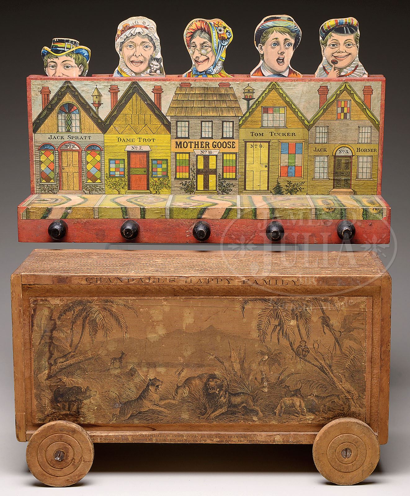 LOT OF TWO EARLY WOODEN TOYS. Lot includes 1) A Mother Goose paper over wood animated game. Possibly by Bliss. Paper on wood images of famous characters pop up when front knobs are pulled (five characters). 2) Crandall’s “Happy Family”. 1875 wooden depiction of caged circus wagon with jointed wood figures of circus animals (approx. 12 figures). SIZE: Largest 19″ l. PROVENANCE: The Diane and late Steve Olin collection. CONDITION: Very good plus. 13271-16 (600-800) Auction: Advertising, Toy & Doll - Fall 2013 Please Note: All prices include the hammer price plus the buyer’s premium, which is paid by the buyer as part of the purchase price. The prices noted here after the auction are considered unofficial and do not become official until after the 46th day. |