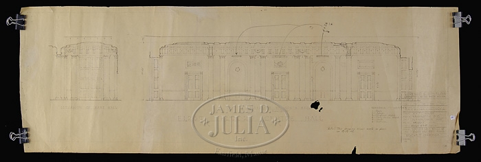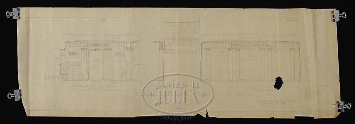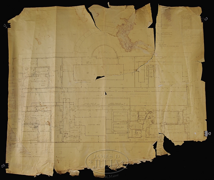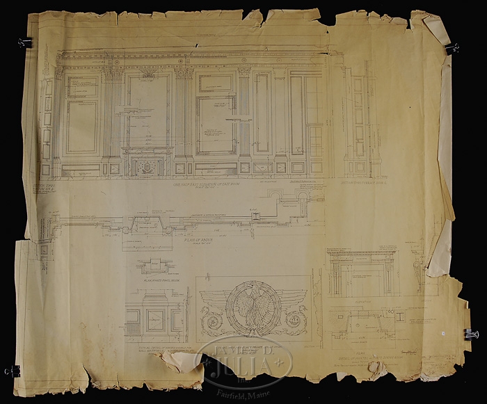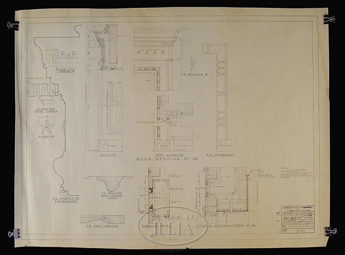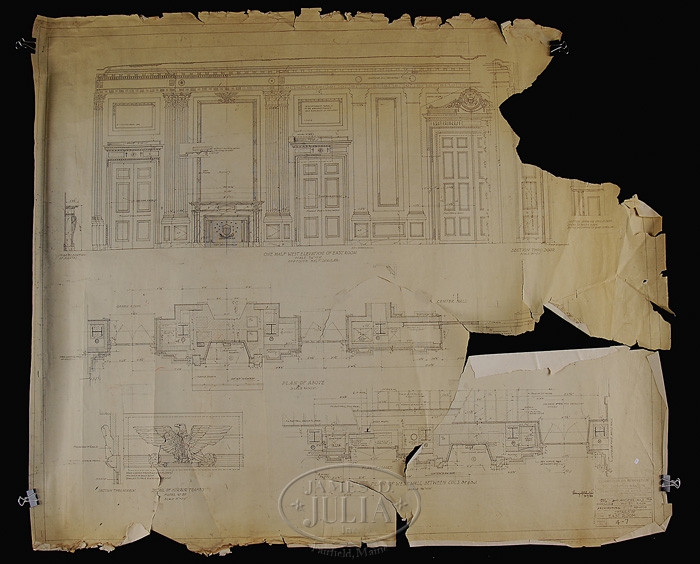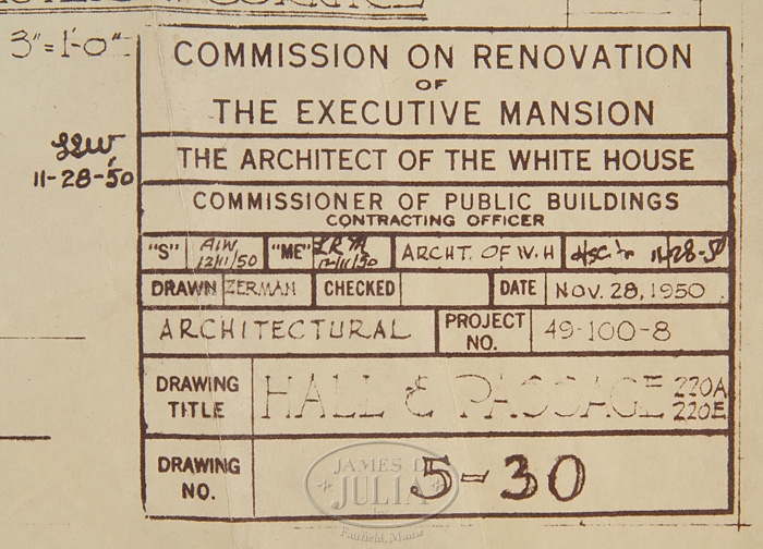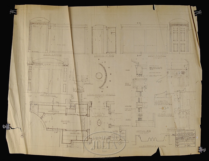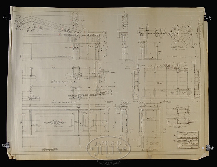 23 ARCHITECT COPIES OF BLUEPRINTS FOR THE WHITE HOUSE, CIRCA 1951. The title block “Commission on Renovation of the Executive Mansion-The Architect of the White House-Commissioner of Public Buildings Contracting Officer-Mostly dated between 1950-1951. Some have minor hand written annotations including initials and dates for Lorenzo S. Winslow who Truman had picked as White House architect along with William Adams Delano. They both had a fashionable architectural practice in Manhattan. The renovation of the White House began in 1949 and ended on March 27, 1952. Some stamped on reverse “Harry Alexander, Inc.” 1) Basement Floor Plan. 2) Ground Floor Plan. 3) Architectural Details of the East Room. 4) Details of the East Room. 5) Private Dining Room Fireplaces. 6) Detail Stairs #1. 7)Detail of Stairway. 8) Basement Mezzanine Plan. 9) Details of the North Hall and Book Storage Room. 10) Windows in West Seating Hall and East Hall. 11) Details of Firebacks, Green and Blue Room. 12) Fireback Details East Room. 13) Models in Main Stairway. 14) Breakfront Bookcase, Center Hall Second Floor. 15) Plan Details Room G-1. 16) Details of Room G-15. 17) Details of Room G-9. 18) Hall and Passage. 19) Green Room Details. 20) First Floor Center hall. 21) First Floor Entrance Hall. 22) North and West Wall Center Hall. 23) First Floor Entrance Hall. SIZE: 1-8) Approximately 41″ x 48″. 9-18) Approximately 32″ x 42″. 19) 25-1/2″ x 36″. 20-23) 12-1/2″ x 36″. CONDITION: Larger examples are “as is” with rips, losses and discoloration. Medium sizes are generally good with some losses and rips. Smaller sizes with losses and rips. 9-95760 (12,000-16,000)