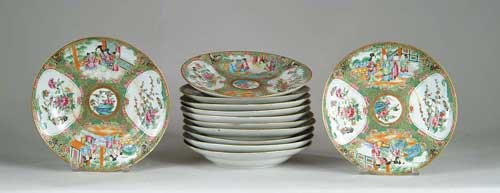 SET OF TWELVE ROSE MEDALLION SHALLOW BOWLS. Standard decoration with figures and flowers. SIZE: 9-3/4” dia. x 1-3/4” h. CONDITION: Four have rim chips, others are free of chips and cracks. 9-99098 (1,000-1,400)