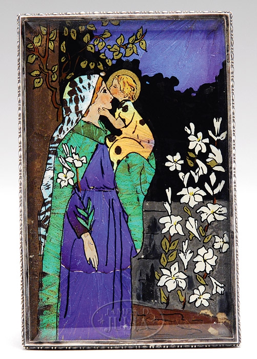 SILVER FRAMED MADONNA PICTURE. Pre-Raphaelite style picture backed with different colored foils depicts a Madonna and child with flowers, woods and bright blue sky. Frame having English hallmarks, Birmingham,1923, maker “T.L.M.”. Frame having a wood backing with easel support. SIZE: 5-1/2″ x 3-1/2″. CONDITION: Very good. 9-90673 (200-300)