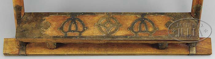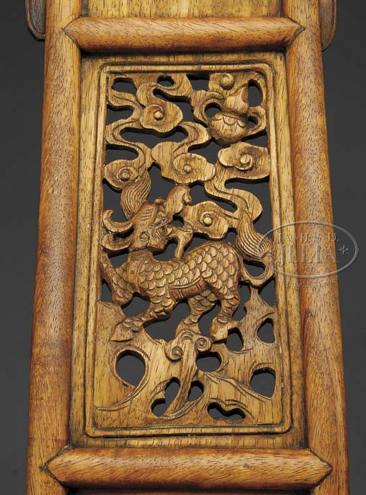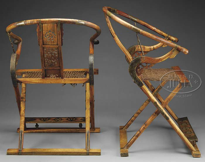 PAIR OF MING STYLE JIAOYI CHAIRS. Chinese, Ming style. The arched back continuing to downswept arms with outscrolled hand grips on S-curved supports, each with a pierced element of an archaic dragon centering a woven seat, the seat rail carved with scrolling dragons. Serpentine backsplat with pierced panels carved with a kylin and an archaic dragon. Raised on X-form hinged legs. Frontal legs with platform foot rest adorned with sheet brass decorative elements. Legs terminating in rectangular platform stretchers. Chair adorned overall with sheet brass ornamentation. SIZE: 1) 42″ h x 27-1/2″ w x 27-1/2″ d. 2) 40-1/2″ h x 27″ w x 28″ d. PROVENANCE: Property of the Royal Family by descent. Signed letter of provenance by Mme. Hengyi Aixinjueluo accompanies this lot. CONDITION: Surfaces of chairs have been scrubbed and oiled. One vertical brass element proper right arm missing. Otherwise very good. 9-24090 (100,000-150,000)