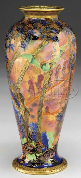 WEDGWOOD FAIRYLAND LUSTRE VASE. Extremely nice Fairyland Lustre vase in the Imps on a Bridge pattern shows crimson imps walking across a bridge with a green Roc bird flying above with other fairies and imps looking on. All is set against a flame lustre ground. Signed on the underside with gold Portland vase mark, “Wedgwood Made in England” and “Z5360”. SIZE: 10-1/2″ t. CONDITION: Very good to excellent. 5-63790 (8,000-10,000)
