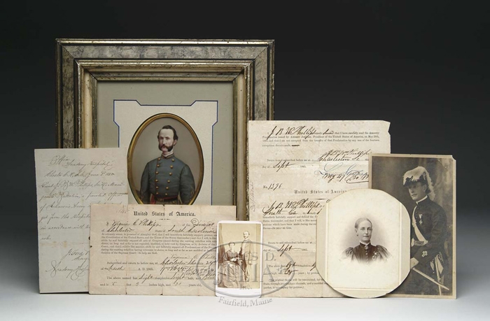 MAGNIFICENT FRAMED OVAL OIL MINIATURE PORTRAIT OF A CONFEDERATE ARTILLERY LIEUTENANT FROM SOUTH CAROLINA. Oval portrait descended directly from the family of 2nd Lt. John Benjamin Witherspoon Phillips, Company B, Manigault’s Battalion, SC Artillery, (Smith’s Company). Portrait measures 5-1/2” x 4”, is convex in form, and depicts an attractive young Confederate officer. His hair is swept to the left having long sideburns and a combed turned up mustache. He is wearing the gray frock coat of a Confederate 2nd Lt. of artillery with dbl-breasted frock coat with 14-button front, the edges piped in crimson, and sleeves decorated with the braid of his rank. On each side of the collar is a sgl gold bar indicating his rank, 2nd Lt. He is wearing the crimson sash of an officer with a sword belt and stylized oval belt plate. Hanging from his left waist is a gold watch fob and key. Painting is mounted in a multi layered mat, the primary being an oval gilt/gesso and wood frame approx. 1/4” deep overlaid by cream colored mat with a black edge decoration overlaid by a gray colored mat cut in trapezoidal form having a painted blue inner edge. Mats and painting are in a deep fancy wood and gesso frame faux painted to appear as ivory with two black lines. CONDITION: Painting is in excellent condition with bright colors and no defects. I am uncertain as to the substrate upon which this portrait was executed. Its smooth surface convex indicates that it may be painted on ivory or porcelain. CONDITION: Painting is in superb condition. Mats are very good with slight areas of dust and dirt. Frame is good with edged chipping here and there. Some of the gilt is fading. Back of the frame has been recovered in new paper. Accompanying the photograph are a number of documents and post war photographs. There is a post war carte de visite of Lieutenant Phillips standing next to his seated wife in civilian clothes. Photo is mounted on a pink card signed “S.T. Souder, Photo”. Back mark is fancy Victorian printing in gold with an armorial crest “Souder/Charleston,/S.C./263 King St. opposite Hastel St”. In addition, there is a cabinet card of his wife named Virginia Willis Phillips circa 1890 in a black dress with a pair of spectacles pinned to the left shoulder and having a large oval broche at her neck with a portrait of her husband within. Finally there is a photograph of Juilian Phillips in a 3/4 length view in full fraternal regalia (Lt. Phillips’ son). CONDITION: Carte-de-visit is excellent. Slight wear to the top edge. Cabinet card of Virginia Phillips has been severely trimmed, forming roughly an oval. Photograph of his son is bent at the upper right hand corner and has a minor loss to the left-hand corner. Three documents accompany the portrait, one being partially printed oath of allegiance for Virginia Phillips of the District of Charleston, State of SC. Subscribed and sworn on March 24, 1865 before 2nd Lt. William B. Eaton 127th Regiment NY Vol. Second document is partially printed Amnesty Proclamation and Oath of Allegiance for J.B.W. Phillips dated September 4, 1865 before Maj. Levi Stuber, Provost Marshal. Third document is an A.L.S. from Jay Ford Puolean, Surgeon in Charge, Academy Hospital, Chester, SC. The letter reads: “Office Academy Hospital, Chester S.H., S.C., June 3d, 1865. Lt.: J.B.W. Phillips, “Company D” Mani-Gault’s Battalion, A paroled Officer of Johnson’s Army is hereby dischar-ged from this Hospital, to report home in accordance with the terms of his pa-role”. CONDITION: Documents are in very good condition with light foxing overall. Virginia Phillips’ parole has minor losses at the top edges. Lt. Phillips enlisted in Manigault’s Battalion on February 28, 1862 as a Pvt. He became acting Battalion Ordnance Sergeant in June of 1862 and achieved that rank on January 31, 1863. On June 6, 1863, he was elected 2nd Lt. of Co. B and was detached as the Ordnance Officer and Legare’s Point, S.C. He commanded 40 men in action on the Ashepoo in May of 1864. He commanded the reserves at Rivers’ Causeway and spent time on picket duty and in charge of his company at Battery Island and Sucessionville. He participated in the evacuation of Charleston on February 17, 1865 and in the Battle of Bentonville, NC in March of 1865. He was paroled at Charleston, SC on September 4, 1865. A magnificent portrait accompanied by important military correspondence and documents, recently acquired from the Phillips family. 4-55120 (10,000-20,000)