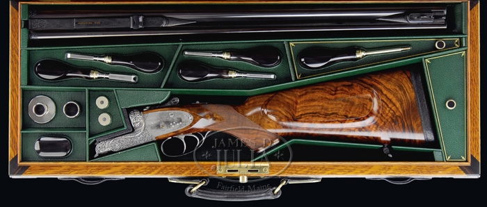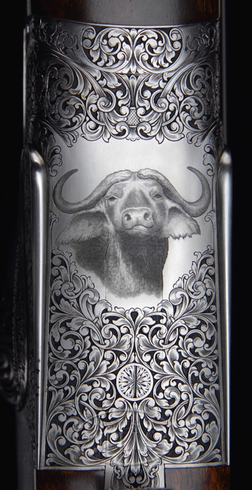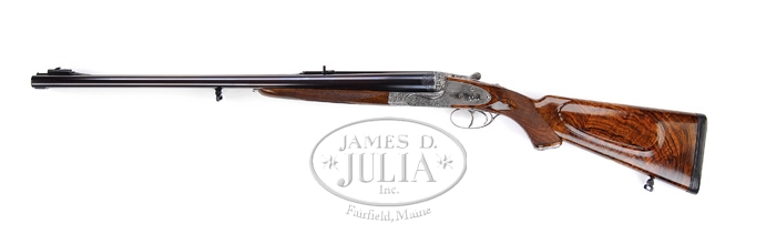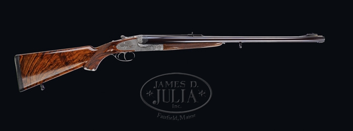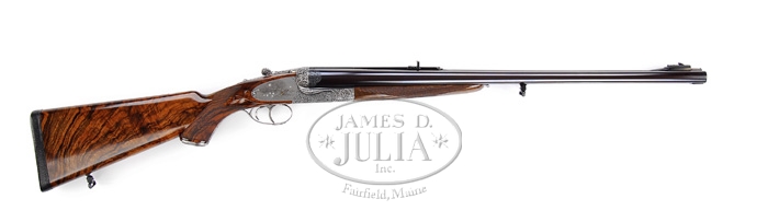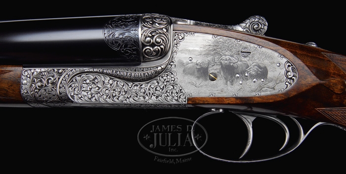 *ROYAL PRESENTATION CASED HOLLAND & HOLLAND BIG BORE DBL RIFLE. SN 35649. Cal. .577 NITRO EXPRESS. Chopper lumped 26″ bbls with pedestal front sight having large ivory bead flip-up to fine silver bead sight. Matted quarter rib with two leaf Express sight; one standing and one folding with gold center lines. Quarter rib in front of rear sight is engraved “.577” and behind rear sight engraved and gold inlaid “ROYAL PRESENTATION”. Right bbl engraved “HOLLAND & HOLLAND”, left bbl engraved “33 BRUTON ST. LONDON.ENGLAND.”. Reinforced sidelock action is engraved by P. Coggan and signed on both sideplates. The fabulous relief engraved intertwine foliate arabesque pattern is accented by Bulino style cape buffalo motif. Left plate has three glaring bulls standing at the edge of a woodland scene with mountain in background, right plate has five bulls with a much more relaxed look and bottom has portrait of a majestic bull. The fences are exceptionally deep relief engraved and the reinforcing area on both sides of receiver are engraved “HOLLAND & HOLLAND”. The reinforced extended top tang carries full coverage relief engraving with “SAFE” in gold. The rolled edge triggerguard is fully relief engraved with “35649” inlaid with gold. Sideplates also have gold lined cocking indicators. Mounted with fabulous streaky Circassian walnut with checkered full pistol grip hsving relief engraved trapdoor cap, oval non-engraved initial shield, shadowed cheekpiece, raised dropper points and leather covered recoil pad. Buttstock and lower rib are mounted with sling swivels. The push button release forend has full wrap-around checkering and exposed metal is relief engraved. Dbl triggers and ejectors with front trigger being articulated and checkered. Weight: 14lbs 10oz. Accompanied by a fabulous makers oak and elephant leather case compartmentalized and covered with soft green leather equipped with turn screws, cleaning rod, snap caps, nickel lubricant bottles and strike plate. Please Note: Consignor states the special presentation engraving & presentation case with this gun is currently a $30,000 up-charge. CONDITION: Extremely fine. Appears unfired since regulated with bbls retaining virtually all orig blue with remaining metal French gray with shaded background. Wood retains virtually all of its beautiful hand-rubbed oil finish and you really have to look to find even the lightest of marks. The accompanying case is in equal condition. 4-59905 BT111 (95,000-145,000)