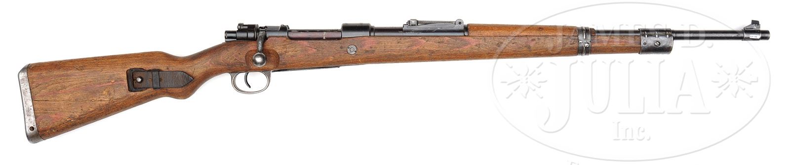 *◊ WAFFENWERKE BRÜNN 8MM K98k RIFLE. SN 4520. Cal. 8mm. Late WWII Kriegsmodell produced in Czechoslovakia under German occupation. Rifle is in standard Kriegsmodell configuration with stock screws on front and rear stock band, no takedown disc in the late laminate stock and has simple hole drilled through buttplate for bolt takedown. Metal parts are largely unnumbered with the exception of the receiver and bolt body. Top receiver marked “Mod.98” and “dou.45”, and left bbl & receiver marked with British proofs and two other proofs struck out after the war. Comes with “L&F” marked wartime sling. Good example of last ditch K98 production. PROVENANCE: Collection of Dr. Geoffrey Sturgess. CONDITION: Good. Stock shows much use with dings and scuffs. Metal parts retain 95% bluing with most wear on the sharp edges of the front and rear bands. Bore is dark, fair with strong lands, but should clean up. 4-53187 DW11 (1,000-3,000)