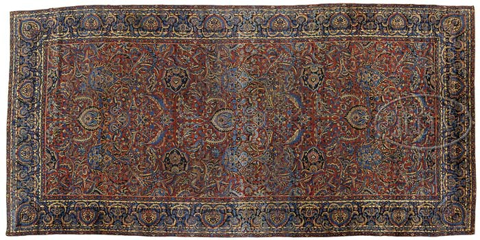 SEMI-ANTIQUE KERMAN PALACE CARPET, SOUTH PERSIA. Last quarter 19th century. Woven overall with large lotus blossoms framed within scrolling leaf tips and densely populated overall with floral vinery. All in shades of indigo, beige and gold and pinks on a pale plum field. Main border similarly decorated with lotus blossoms, scrolling vinery and arabesque flower heads. SIZE: 10′ 8″ x 21′ 4″. PROVENANCE: From a New England Institution. CONDITION: With rich dark colors. With good pile overall. Central third with wear. Foundation showing in some areas. Overall a fine carpet in very good condition. 9-22389 (4,000-6,000)