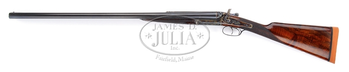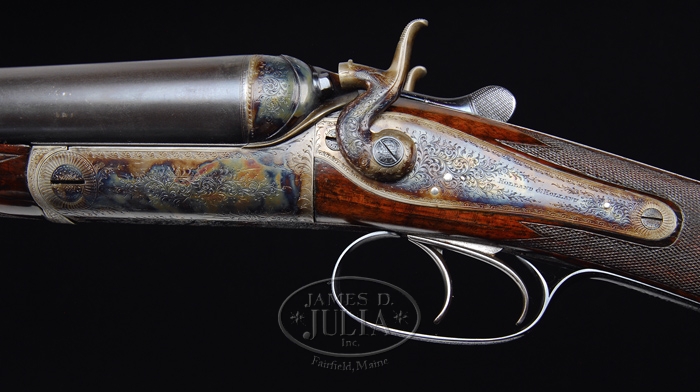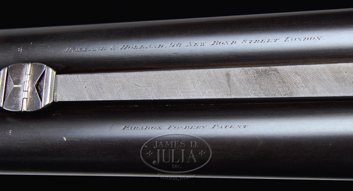 RARE HOLLAND & HOLLAND CASED PARADOX BORE HAMMER DOUBLE BARREL SHOTGUN. SN 11966. Cal. 12 ga. Fine early Holland with 28″ steel bbls with Paradox rifling at muzzles. Bbls have a concave smooth rib with caterpillar style front sight and a matted quarter rib with 2-leaf folding rear sight, a third bite rib extension & dbl underbites. It is black powder proofed. It has a round action with back action locks which are very tastefully engraved with about 50% coverage fine foliate arabesque patterns. All appended metal is engraved to match. Fences & firing pin shields are beautifully scalloped and it has a long top tang which extends about 1-1/2″ up over comb. Bbls are marked with maker’s name & address on right side and “PARADOX FOSBERY PATENT” on left side. Lockplates have maker’s name on each side. Mounted with very nicely figured, streaky burl walnut with checkered splinter forearm and straight hand stock, 14-1/2″ over a solid red pad. Accompanied by a fine early walnut casing with recessed brass handle in top and reproduction labels inside lid. Lined with rose colored velvet & compartmented in bottom for shotgun, bbls, a nickeled oiler & various Paradox implements. Makers confirm 1892 manufacture. Bore diameter: left – .740, right – .740. Bore restrictions: left – .028, right – .028. Wall thickness: left – .034, right – .037. Drop at heel: 2″, drop at comb: 1-3/8″. Weight: 7 lbs. 6.72 oz. CONDITION: Fine to very fine. Overall retains virtually all of a fine professionally restored finish with a blue/brown finish on bbls and a couple of scattered spots of pitting with a small ding in left bbl. Receiver, lockplates & hammers retain bright bone meal case colors. Wood is sound with light nicks & scratches. Mechanics are fine, bright shiny bores. Case has three cracks in lid and others in bottom with handling & storage marks, light soil in interior with light wear, possibly an old re-line. 4-32763 JR243 (12,000-16,000)