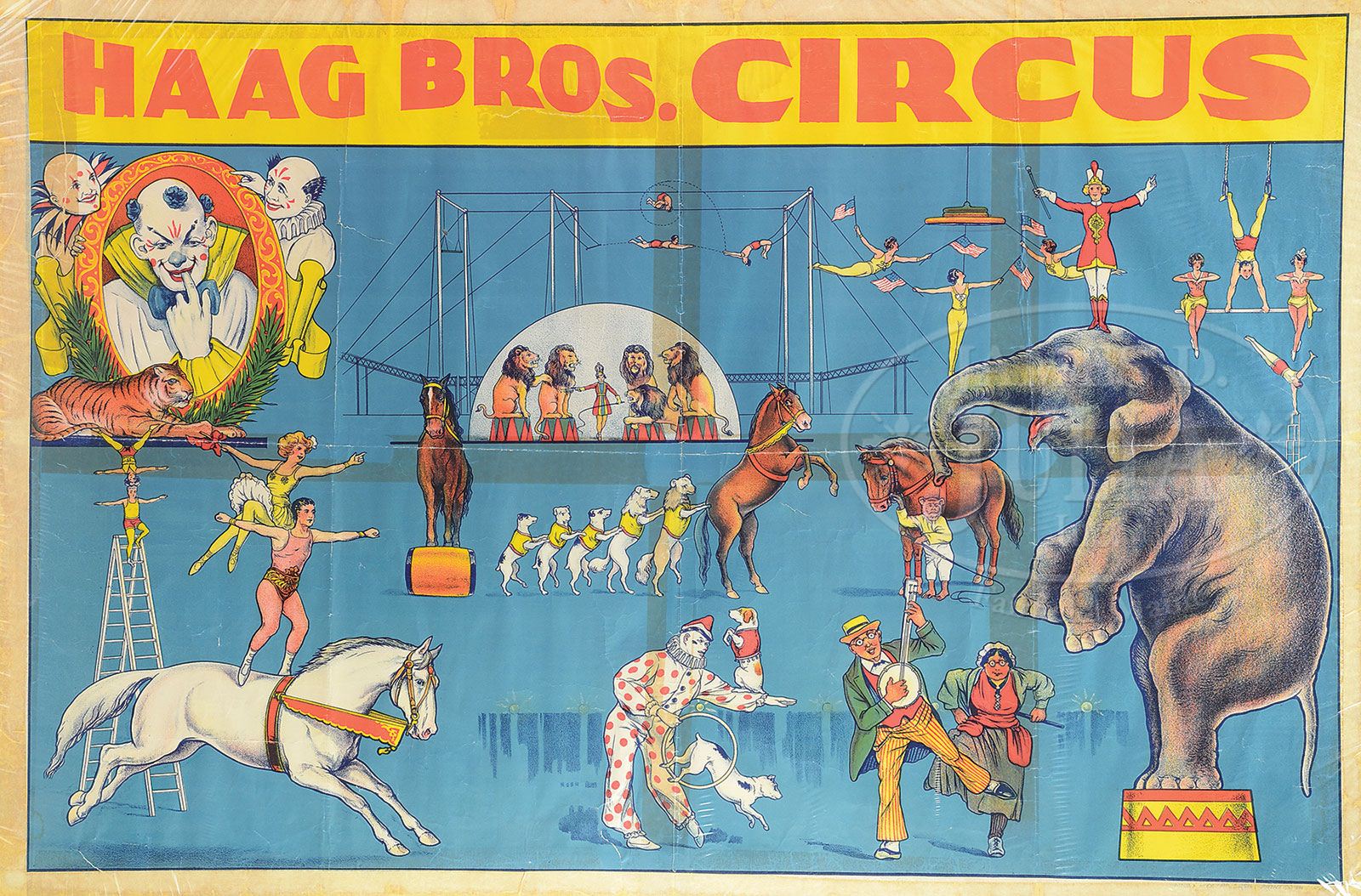 LOT OF 4 NICE OLD COLORFUL CIRCUS POSTERS. Including Haag Brothers, Robbins Brothers, Hagendeck-Wallace, and Walter L. Main. Each with wonderful, colorful images depicting various animals, acrobats, trapeze artists and more. SIZE: Most measure 40″ w x 27″ h. CONDITION: Each has fold creases. The border of the Haag Brothers has been reinforced with tape and also the Robbins Brothers has some tape reinforcement along the edge and at one time a paper banner was probably attached to the bottom with directions or location information; it is no longer there. The Hagendeck-Wallace poster is reinforced on the edges and top with tape and with some fold creases. The Walter L. Main with some very light staining on the edges, some vertical creases. 1-12551 (500-1,000) Auction: Advertising, Toy & Doll - Fall 2012 Please Note: All prices include the hammer price plus the buyer’s premium, which is paid by the buyer as part of the purchase price. The prices noted here after the auction are considered unofficial and do not become official until after the 46th day. |