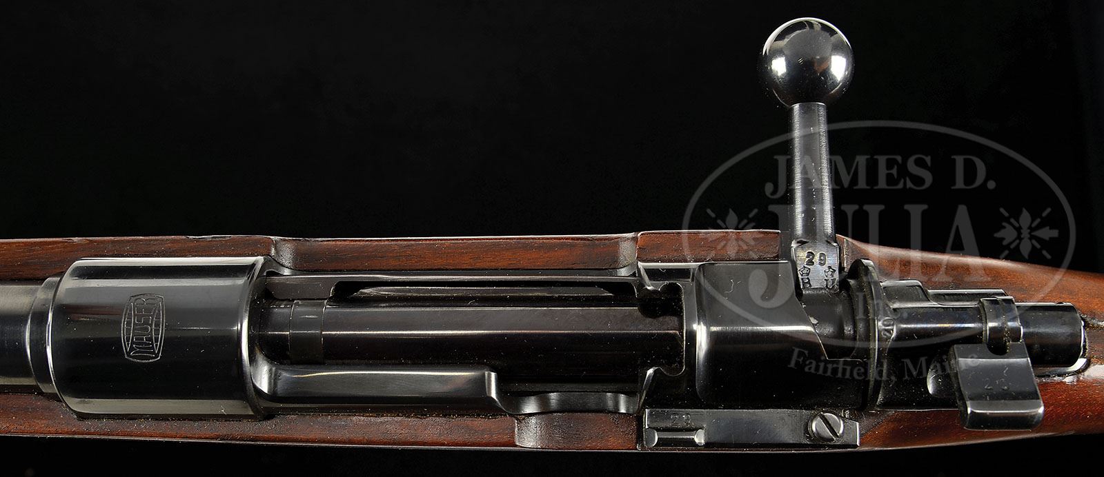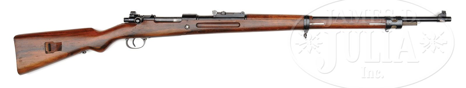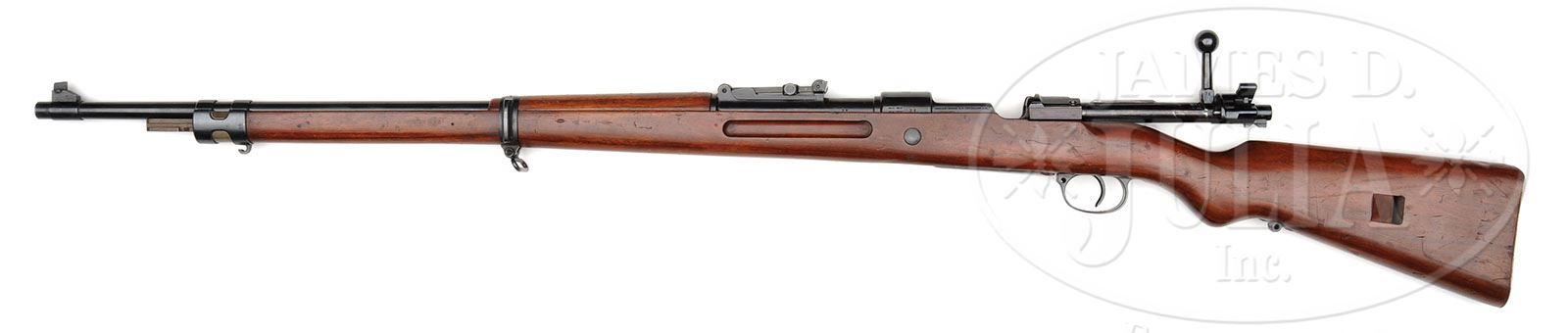 *◊ MAUSER 7MM GEWEHR 98 WEHRMANNGEWEHR RIFLE. SN 29. Cal. 7×57 mm. Excellent condition interwar Mauser Wehrmanngewehr, based on the G98, manufactured by Mauser-Werke, Oberndorf, on special order. This weapon appears to be all matching including blued straight handled bolt assembly. Top receiver is marked with the Mauser Barrel logo and left side bears the two-digit SN 29, BUG N proofs, firm’s name and address. Left side bbl marked with weapon SN only. Micrometer tangent rear sight is similar to the Kar 98b with preset distance 300 meters. Nice walnut stock has finger grooves, all orig finish and no visible markings or numbers. High polished steel buttplate and bayonet lug left in the white. PROVENANCE: Collection of Dr. Geoffrey Sturgess, ex-Visser collection. CONDITION: Bore is dark, with strong lands and grooves, and should clean up. Stock is in overall excellent original condition with only very slight handling marks and few scratches. 4-53160 DW51 (4,000-6,000)