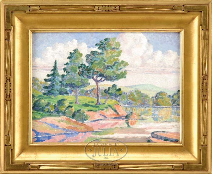 BIRGEN SANDZEN (American, 1871-1954) COLORADO ASPENS. Unsigned oil on canvas board scene shows trees on a grassy point of land with water and tree-lined shore. Green hills in the background under puffy white clouds and a blue sky. A light pastel palette in a nice spring/summer scene. The back has a penciled poem and pen calligraphy and “doodles”. Written on back is “Birgen Sandzen”. Housed in a good, modern, carved gilt frame. SIZE: 12” x 16”. 9-74942 LG (20,000-25,000)