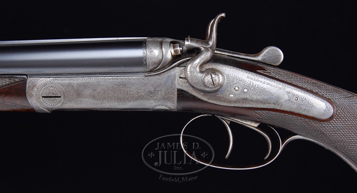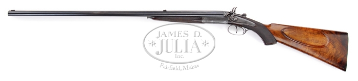 TINY HOLLAND & HOLLAND HAMMER DOUBLE RIFLE SN 7237. Cal. 38 CF (a 38 Spcl. ctg. fits nicely, or could be 360 Rook). Dainty little rifle with 26-3/4” steel bbls, flat matted rib with gold bead caterpillar front sight and 3-leaf platinum line express rear sight graduated 50 to 150 yards. Rib is engraved with maker’s name & address. It has extractor & dbl underbites. It has a tiny round action with deep scalloped firing pin wells & back action locks with delicate, high-spur, gooseneck hammers. Receiver, lockplates, hammers & appended metal are very nicely engraved with about 50% coverage fine foliate arabesque patterns. It has maker’s name on each lockplate. Mounted with very highly figured, marblecake Circassian walnut with tiny checkered splinter forearm & half hand stock with horn grip cap & cheekpiece, 14-1/2” over a checkered butt. Weight: 6 lbs, 11.84 oz. PROVENANCE: Glenn Marsh Collection. CONDITION: Very fine. Bbls retain most of a fine restored blue. Receiver & lockplates retain 50-60% faded case colors, stronger in very sheltered areas with balance turned silver. Stock has a small crack in top of wrist, otherwise wood is sound with light handling & use marks and retains most of a restored finish on forearm and most of its orig hand rubbed oil finish on buttstock. Mechanics are fine, strong bright bores with fine pitting. 4-59706 JR312 (3,000-5,000)