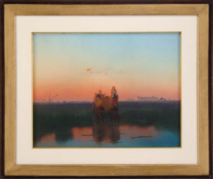 ROMANO (Italian 19th/20th Century) PAIR OF ITALIAN SCENES. Both identically housed in a Eastlake type wood frames with linen mattes and gold binders. Each is a large gouache. One is signed lower left “Romano” and shows a harbor view with a volcano in the distance, with a horse drawn carriage and a person on road in the foreground. The other signed bottom right “Romano” shows a man, woman and child in a hay wagon pulled by oxen. They are in a pool of water with classical ruins in the background, under a sunset sky. SIGHT SIZE: 16-3/4” x 21-1/2”. CONDITION: Very good. 9-72781 (1,500-2,500)