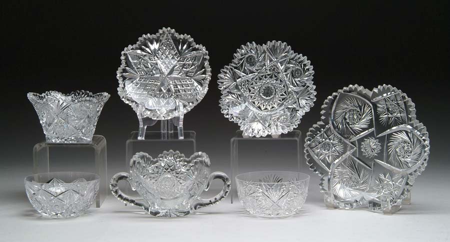 SEVEN CUT GLASS ITEMS. 1) Cut glass dish in pinwheel and hobstar pattern. SIZE: 8 in. 2) Cut glass dish in strawberry diamond and fan pattern. SIZE: 6 in. 3) Finger bowl in hobstar and fan pattern. SIZE: 4-1/2 in. dia. 4) Finger bowl in hobstar and crosshatch pattern. SIZE: 4-1/2 in. dia. 5) Sugar bowl in hobstar and sunburst patter. SIZE: 7 in. at widest. 6) Fingerbowl cut in pinwheel and fan pattern. SIZE: Approx. 3 in. t. 7) Underplate that matches aforementioned fingerbowl cut in pinwheel and fan pattern. SIZE: 6-1/4 in. dia. CONDITION: Various chips and roughness to all, otherwise very good. Estate of Edwin Schiebel Sr. 5-60157, 5-60171 (300-500)