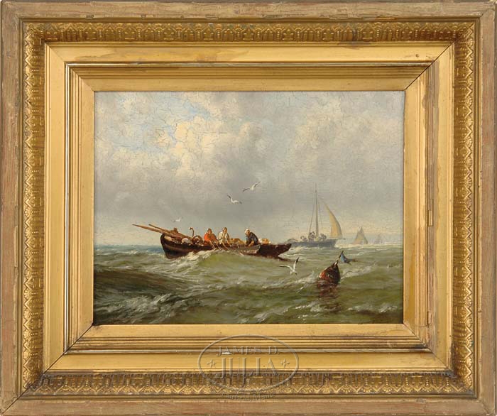 SIGNED (French School, 19th Century) THE FISHER WOMEN. Oil on board marine scene shows three women hauling nets off a fishing boat. Several boats are seen beyond with seagulls flying overhead. Signed lower right with what appears to be “W. Cian…”. Housed in an antique gesso decorated wood frame with gilt liner. SIZE: 11-1/4” x 14-1/2”. CONDITION: Some consolidation to paint, very good. 9-70860 (6,500-8,000)