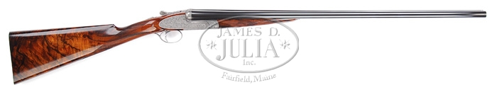 *AWARD WINNING RIZZINI R1-E DBL BBL SHOTGUN. SN 2224. Cal. 20ga. Fabulous R1 with 28″ bbls, choked IMPCYL/MOD, tapered concave rib with single gold bead, engraved “FILI RIZZINI MAGNO VT”. It has 2-3/4″ chambers with ejectors, splinter forend and single trigger. Mounted with truly magnificent Turkish Circassian Exhibition walnut with checkered straight hand stock with 14-3/4″ pull over checkered butt. Spectacularly foliate and floral relief engraved and signed on the triggerplate by the master Muffolini. This exact gun was awarded a gold medal at the Concourse ‘d Elegance for Best in Show (Norman R. Blank Award) at the 2006 Vintage Cup. Bore diameter: left – .618, right – .619. Bore restriction: left – .011, right – .006. Drop at comb: 1-3/8″. Drop at heel: 2-1/4″. Weight: 6lbs 3oz. Accompanied with Nizzoli leather case with makers label and specification card on lid having green canvas and leather covering. CONDITION: Extraordinarily fine. Gun appears unfired with virtually all its original factory finish. Case is as new. 4-32847 BT114 (80,000-125,000)