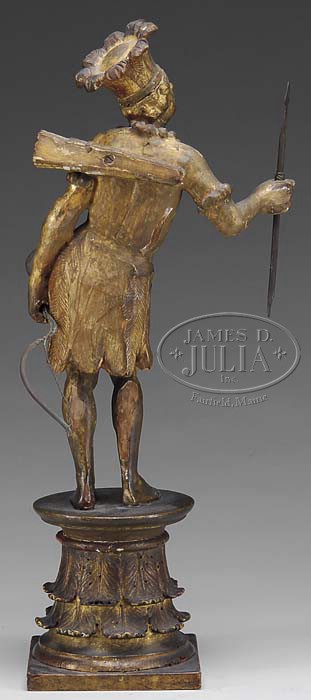 18TH/EARLY 19TH CENTURY WOOD CARVING OF AN INDIAN WARRIOR. This wonderful detailed wood carved & gessoed figure of an Indian warrior depicts a figure with a waist cloth consisting of feathers and a headdress of similar feathers. He holds a bow in one hand, a spear in the other and a quiver of arrows rest on his back. Mounted on a carved pedestal with relief leaf design. All in wonderful old antique gilt. Some of the feathers are highlighted with traces of red. SIZE: 19″ h. CONDITION: Surface soil & with much original old patina, some slight imperfections. 9-21893 (5,000-9,000)