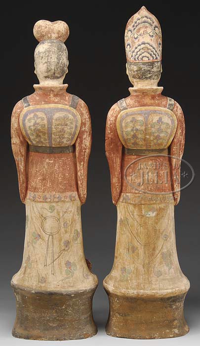 PAIR OF TANG STYLE TERRACOTTA COURT FIGURES. Chinese. Each figure in ceremonial headdress and robes, polychrome paint decorated. Each standing on a conforming plinth. SIZE: 45″ h and 42-1/2″ h, respectively. PROVENANCE: From a private East Coast collection. CONDITION: Structurally very good. Painted surfaces remain bright, but with extensive wear. 9-23942 (15,000-20,000)