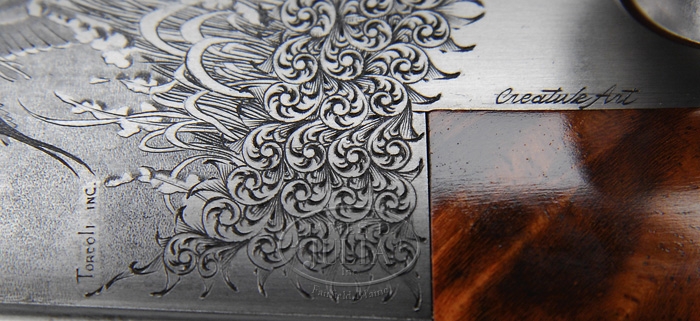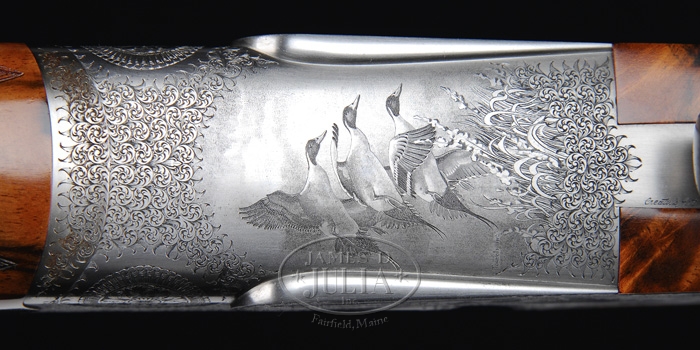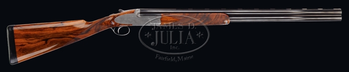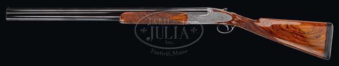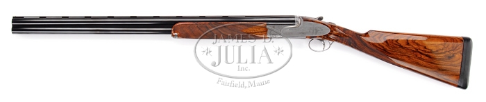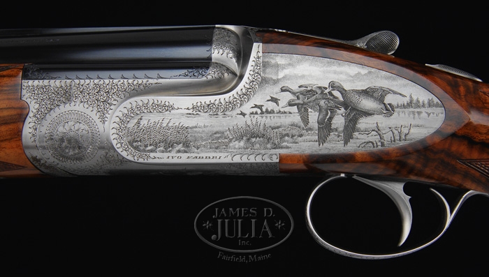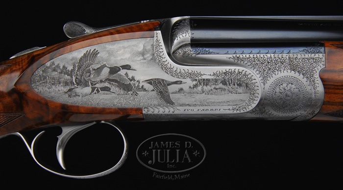 *FANTASTIC IVO FABBRI SUPERPOSED HAND MADE SHOTGUN. SN 3538. Cal. 12 ga. Spectacular shotgun with 28″ bbls choked FULL/IMP-MOD with tapered flat matted ventilated rib, sgl bead, ejectors & sgl non-selective trigger. Top bbl is marked on right side of rib “VACUUM ARC REMELTING STEEL” and with maker’s name & address on left side. Receiver has pinless full sidelocks with full Bulino-style scenes of a flock of wood ducks on left side flying over a marsh scene, three mallards over a marsh scene on right side and three pintails on bottom with marsh grass in foreground, surrounded by extremely well-executed patterns of foliate arabesque engraving. Bottom vignette is signed “TORCOLI INC.” and trigger plate is signed “CREATIVE ART”. All appended metal is engraved to match. Mounted with extremely beautiful, streaky, honey & chocolate Circassian walnut with checkered semi-beavertail forearm and straight hand stock, 15″ over a leather covered pad. Bore diameter: top – .724, bottom – .724. Bore restrictions: top – .030, bottom – .020. Wall thickness: top – .034, bottom – .033. Drop at heel: 2-1/8″, drop at comb: 1-1/4″. Weight: 7 lbs. 7.04 oz. CONDITION: Extraordinarily fine, appears to be new & unfired. Retains all of its orig factory finish to both metal & wood with strong bright blue on bbls and bright coin finish on balance of metal. Stock has a few, very minor storage mars with crisp brilliant finish. Mechanics are crisp, brilliant shiny bores. Only a few of these wonderful shotguns are made each year and the wait time for an order is usually several years. The replacement cost is in excess of $100,000. 4-59901 JR318 (65,000-95,000)