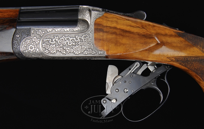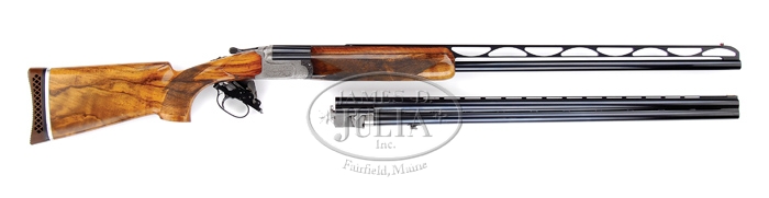*PERUGINI & VISINI MAESTRO GRADE TRAP COMBO OVER/UNDER SHOTGUN. SN 2117. CAL. 12GA. Combination trap gun has 34″ under sgl bbl with stepped and tapered high rib, ray-bar front bead and white mid bead fitted with screw-in choke tube. Over/under bbls are 29-1/2″ choked FULL/MOD with tapered flat filed rib, vented mid-rib, and white front bead. Coin finished box lock action is fully engraved with floral sprays and ribbons encased in fine scrolls signed “REVERA V.”. Automatic ejectors with removable single trigger group that is adjustable for length of pull. Mounted in figured honey-gold European walnut checkered field style forend and full pistol grip stock with right-hand palm swell. Adjustable length of pull from 14-3/4″ to 14-3/8″ over an A.D.S. adjustable recoil pad and recoil reducer. Drop at heel 1-3/8″, drop at comb 1″ at neutral adjustment. Weight 9 lbs, 1.3 ozs. CONDITION: Fine. Bbls retain 98% orig finish with signs of assembly and sharp edge wear. Receiver, trigger group, and forend metal retain virtually all of their factory finish with minor thinning at the handling points. Wood is sound and shows numerous small dents, scratches, and assorted handling marks retaining 90-95% of the orig factory finish. Mechanically fine. Bores bright and shiny. 4-32623 JWD24 (4,000-7,000)