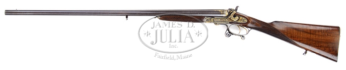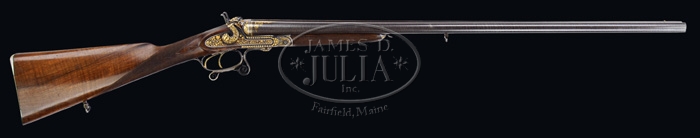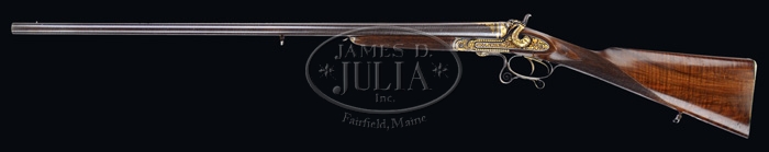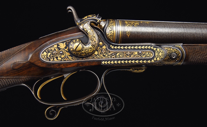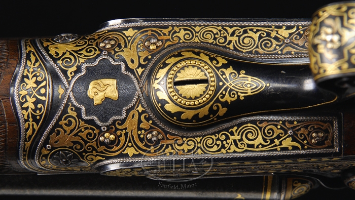 FANTASTIC COMPLETE GARNITURE OF A NARCISO ZULAICA SPANISH MADE DAMASCUS HAMMER DOUBLE BARREL SHOTGUN. SN NSN. Cal. 16 ga. Fantastic gold encrusted shotgun with 29-3/8″ fine pattern Damascus bbls choked CYL/CYL with tapered concave smooth rib & sgl bead. Top rib is inlaid in gold “FA. de NARCISO ZULAICA EN EIBAR” and has initials “F.L.C.”, probably the orig owner’s initials. It has extractors with dbl underbites. It has underlever action with attached forearm and back action locks with all of metal encrusted with gold in various foliate & arabesque patterns with applied, raised gold flower blossoms. Lockplates additionally have a dove on each side and have a raised gold micro acanthus leaf border. It has deep scalloped gold-washed firing pin wells with gold encrusted screws and a raised dog’s head on bottom front of receiver. Trigger guard & bottom tang have matching gold patterns with the small vignette of a duck. Triggers are gold plated. Mounted with very nicely figured, tiger-striped European walnut with full checkered forearm & straight hand stock with raised teardrop side panels, 13-3/4″ over a checkered butt with heel & toeplates engraved & inlaid to match. Bottom of stock has a blank silver initial oval and it has narrow European sling loops. Page 1439 of Heer Der Neue Stockel 2, a listing of international gunmakers, shows Narciso Zulaica in Eibar (Spain) 1837-1840. A Google search disclosed a Spanish language listing for the same maker in Eibar in 1864. Given that this shotgun has rebounding hammers and the general overall appearance indicates last half of the 19th century production. Bbl flats have small cartouches, one of which is marked “EXP. / 77”, possibly indicating manufacture date of 1877. Accompanied by an extraordinary Italian or Circassian walnut trunk case with multi-colored wood inlay in lid and engraved German silver corner reinforcements with an elaborate center medallion engraved “F.L.C.” Interior is lined with royal blue velvet and is compartmented for shotgun with a full complement of tools & implements including a turn screw, a firing pin bushing wrench, powder & shot measures, ebony shotshell loading tool, a case trimmer, a stuck & broken shell extractor, a 3-pc brass & wood cleaning rod, a crimping tool and a Sharps-style nickel-plated bullet mold. Right rear corner has a covered compartment containing cleaning implements & orig key. Front of case has ivory keyhole escutcheons & a German silver carrying handle. Bore diameter: left – .679, right – .679. Bore restrictions: left – .000, right – ..000 Wall thickness: left – .031, right – .027. Drop at heel: 2-3/4″, drop at comb: 1-3/4″. Weight: 6 lbs. 12.16 oz. A truly extraordinary & complete garniture. CONDITION: Extremely fine. Bbls retain about all of their fine orig Damascus pattern with slight muzzle edge wear. Receiver, lockplates and all appended metal retain virtually all of their fine orig blue with some slight thinning on opening lever tab. Wood is sound with minor handling & storage marks and retains most of its fine orig factory finish. Mechanics are crisp, brilliant shiny bores. Case has several grain checks in lid and front with minor storage & handling marks with a slight warp in lid. Interior is complete & orig showing only very light wear from shotgun & bbls with no apparent fading. 8-87527 JR260 (27,500-40,000)