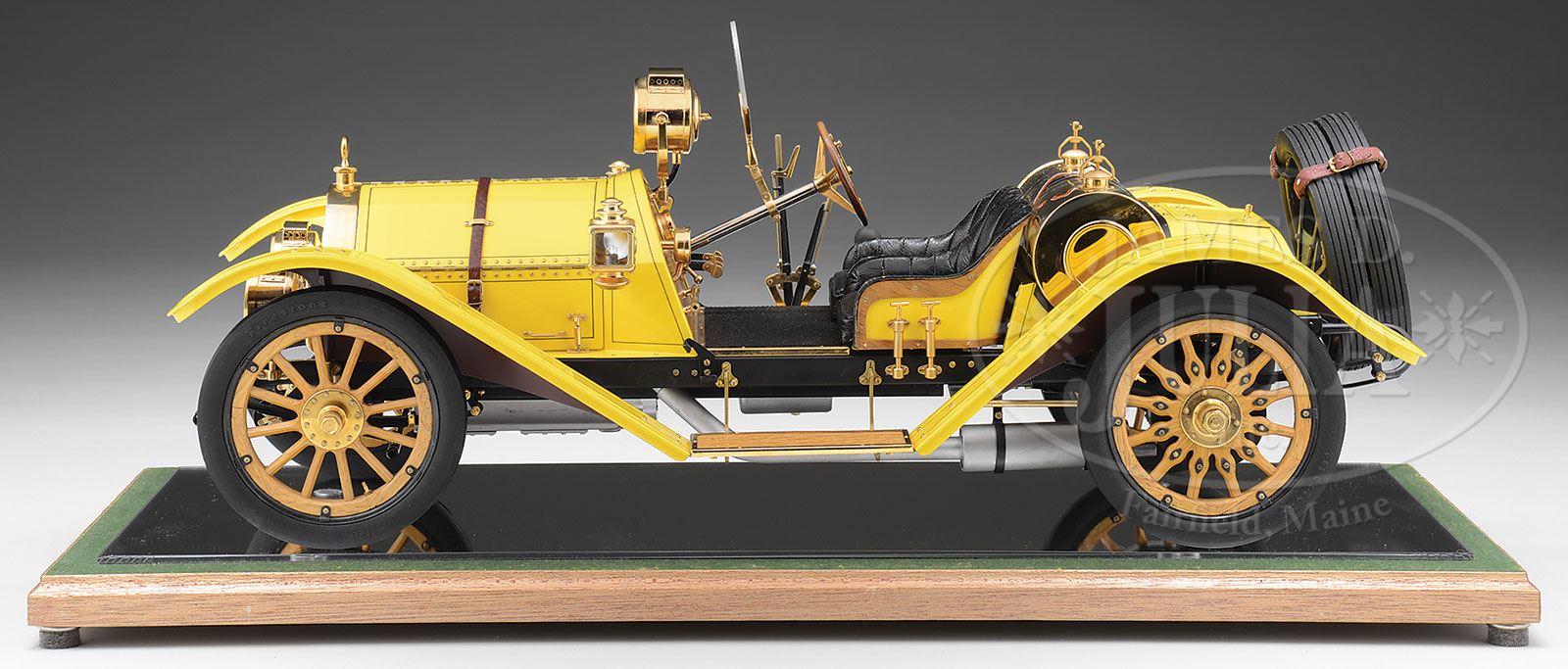 1913 MERCER RACEABOUT SAPOR MODEL. Numbered #13 of only 25, 35J Raceabout by Sapor Modelltechnik, Germany. Mfg. in 1991. Outstanding craftsmanship and attention to detail includes electrically driven completely detailed engine which uses clutch shifting for gear changes. Has working brass headlights, tail light and side carriage lamps actuated by a switch on the completely detailed dash. Wooden gun carriage-spoked wheels, leather upholstery, working steering wheel. All details such as brake and shift levers, radiator and ornament, hinges, rivet detailing are accurately shaped from brass. Crafted from nearly 3000 individual parts. Impressive in design and execution. Comes with external power supply. Also included is original fitted carrying case for model car. SIZE: 21″ l. CONDITION: As new. 1-13000 (3,500-5,000) Auction: Advertising, Toy & Doll - June 2013 Please Note: All prices include the hammer price plus the buyer’s premium, which is paid by the buyer as part of the purchase price. The prices noted here after the auction are considered unofficial and do not become official until after the 46th day. |