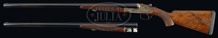 *CASED AUGUSTE FRANCOTTE DOUBLE BARREL SHOTGUN 2-BARREL SET. SN 91409. Cal. 12 ga. Spectacular shotgun with two sets of 28-3/8” bbls numbered “1” and “2” under the respective forearms. No. “1” is choked FULL/IMP-MOD and No. “2” is choked FULL/FULL. Both have raised, concave, hand-matted, tapered ribs with dbl beads, ejectors, dbl chopper lumps with third bite and sgl non-selective trigger. Mounted with extremely fine, beautifully grained, French walnut with two checkered, beavertail forearms & pistol grip stock with teardrop side panels, 14-1/4” over a Decelerator pad. Forearms have lever latches like double rifles. It has full 7-pin sidelocks with cocked indicators, is case hardened with reinforcements on side of receiver and a fine raised rib around fences. Receiver, lockplates & appended metal are all beautifully & very tastefully inlaid with extremely fine gold wire in arabesque patterns. Bottom of receiver has maker’s name in gold. Engraver’s name “PH. GRIFNEE” is in gold on trigger plate. Philippe Grifnee is one of the world’s premier master engravers, currently employed at Holland & Holland and Purdey to engrave their extra special firearms. It is reported that to have Mr. Grifnee engrave a shotgun requires an approximate six year wait and a large checkbook. The bbls & forend latches both have a gold number “1” with bbls number “2” having a small star above the “1”. Accompanied by a green felt lined, leather trunk case compartment for the three pieces of the shotgun and another compartment which contains another trigger plate with dbl triggers, gold inlaid, to match and signed identically. Front trigger is articulated. Also contained in compartment are some spare small parts. BBL #1: Bore diameter: left – .727, right – .727. Bore restrictions: left – .031, right – .023. Wall thickness: left – .028, right – .026. BBL #2: Bore diameter: left – .728, right – .727. Bore restrictions: left – .034, right – .032. Wall thickness: left – .026, right – .021. Drop at heel: 1-1/2”, drop at comb: 1-1/2”. Weight with Bbl #1: 7 lbs. 8.96 oz. CONDITION: Very fine. Retains virtually all of a spectacular, professionally restored finish with crisp, strong blue on bbls and strong, subtle case colors on receiver & lockplates. Wood is sound & retains a beautiful, hand-rubbed finish. Mechanics are crisp, bright shiny bores. Case is equally fine. 4-30354 JR210 (20,000-30,000)