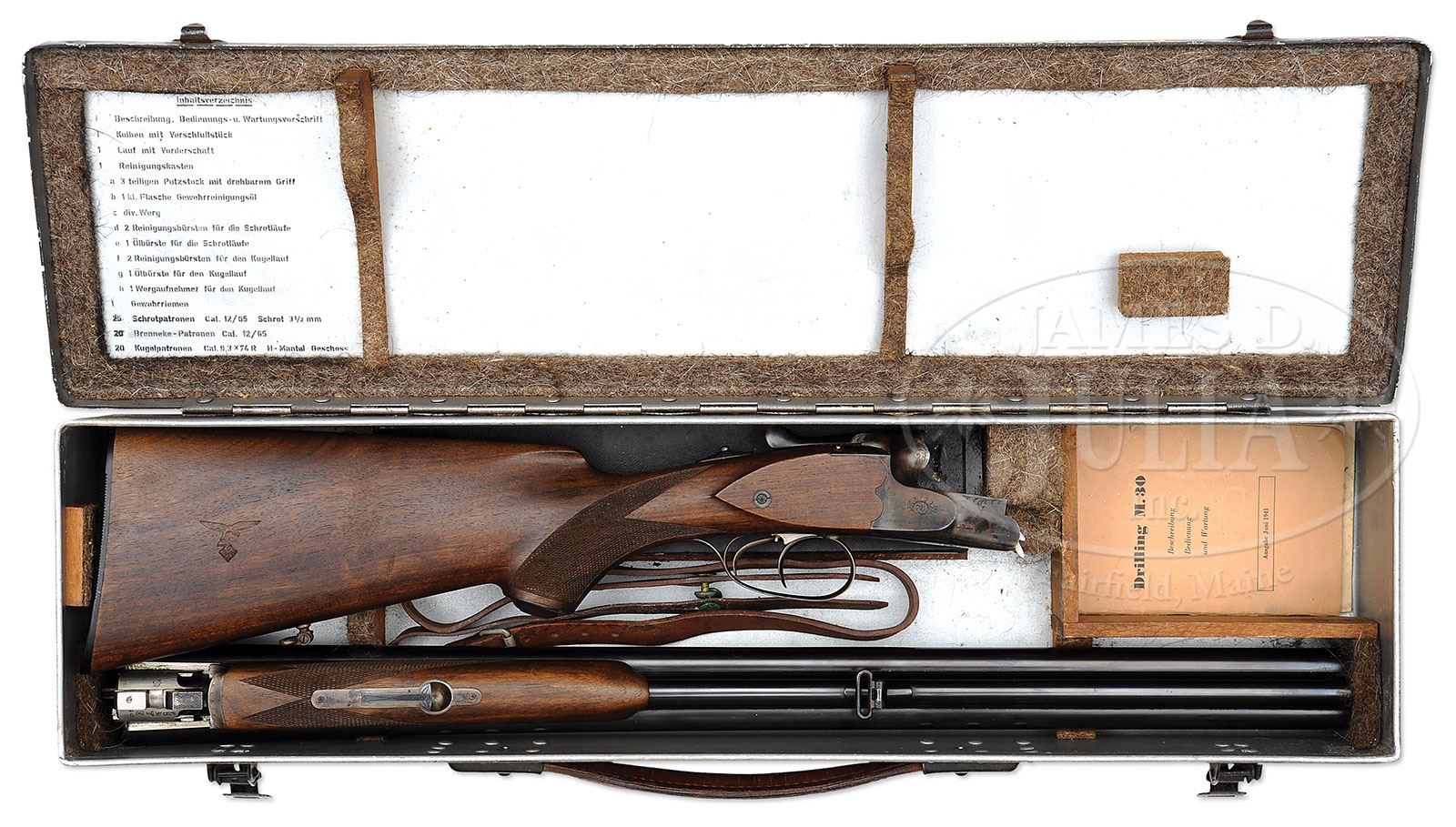*◊ FLAT-ASS NEW UNFIRED J. P. SAUER MODEL 30 DRILLING WITH CASE. SN 338001. Cal. 12 ga X 12 ga X 9.3X74R. Typical J. P. Sauer Luftwaffe drilling has Sauer markings around breech ends of 25-5/8″ bbls and sides of case hardened action, also decorated with sprays of scroll. Bottom of rifle bbl is stamped with 2/42 German proofs and rear lump with Waffenamt “L2”. Luftwaffe eagle is on right side of right bbl and also stamped on right side of buttstock, which features right hand cheekpiece, steel grip cap, and “SSu” (Sauer Suhl) marked ribbed horn buttplate. Drilling is housed in its orig aluminum case with leather handle, marked “Drilling M 30 mit Munition u. Zubehor”. Interior of case has typical felt gaskets, is stencil marked with contents on lid, and contains orig cleaning kit in black cardboard box (components new/unused wrapped in their orig packaging), instruction booklet, very rare shooting (shot pattern) record, and leather sling. PROVENANCE: Collection of Dr. Geoffrey Sturgess. CONDITION: Near new, appears unfired. Metal and wood have only a few light scratches and marks in all of their orig finishes. Bores are excellent. Rifle bore is coated with what appears to be its orig grease, but rifling still visible and mint. Exterior of case has considerable loss and scratches to its orig paint. Leather handle has some loss to top grain, but is otherwise fine. Interior is excellent, all gaskets and blocking intact. Cleaning kit box has some chips and compressions from contact with left fence of action. Sling is a bit dry. Instruction booklet is excellent. Shooting record is slightly foxed and creased. Undoubtedly one of the finest examples of this important military weapon in existence. 4-52042 MGM321 (20,000-30,000)