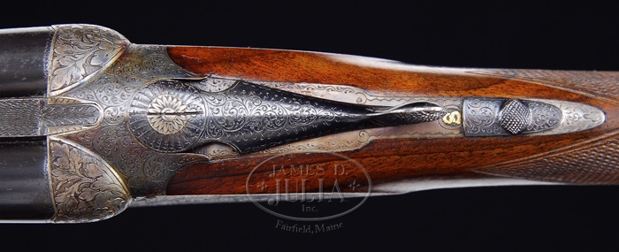 *CASED AUGUSTE FRANCOTTE DELUXE SMALL FRAME DBL BBL SHOTGUN. SN 88304. Cal. 410. Imported by Abercrombie & Fitch, this fine little 26″ Siemens Martin steel bbls choked FULL/IMP-MOD with tapered concave matted rib, sgl bead, Greener crossbolt rib extension, ejectors & dbl underbite with dbl triggers. Receiver is boxlock with sideplates & side clips and is beautifully engraved with 75-80% coverage extremely well-executed foliate & floral arabesque patterns. Appended metal is engraved to match. It has “S” in gold on top tang. Mounted with very nicely figured French walnut with checkered dainty splinter forearm and straight hand stock with raised side panels, 14-1/4″ over a serrated horn buttplate. Bottom of stock has a gold initial oval engraved “C.F.D.” Accompanied by a fine Abercrombie & Fitch burgundy felt lined, tan leather trunk case compartmented in bottom for shotgun & bbls with two open compartments and recesses for snap caps. Lid is embossed “C.F.D.” and front of case is marked “ABERCROMBIE & FITCH”. Unable to gauge bore diameter, bore restrictions or wall thickness. Drop at heel: 2-1/4″, drop at comb: 1-3/8″. Weight: 5 lbs. 1.28 oz. CONDITION: Extremely fine. Bbls retain 98-99% strong orig blue with minor muzzle edge wear and a spot of pitting at left muzzle edge. Receiver & side plates retain virtually all of their orig fine case colors, bright & strong. Opening lever & trigger guard retain about all of their orig bright blue. Wood is sound with light handling & use marks and retains about all of its orig hand rubbed oil finish. Mechanics are crisp, brilliant shiny bores. Case is extremely fine with a minor scrape or two on outside with very minor wear inside. 4-31588 JR247 (6,000-9,000)