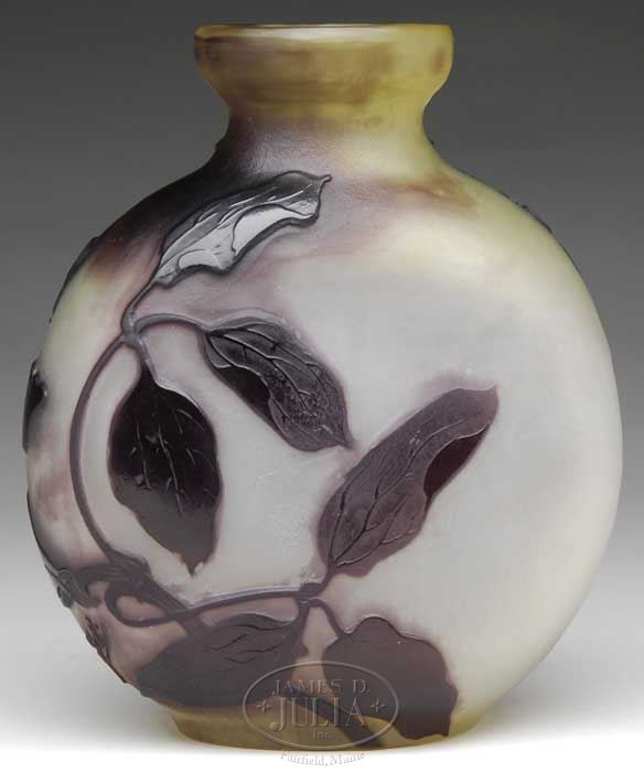 GALLE FLORAL CAMEO VASE. Lovely Galle vase has deeply cut purple cameo flowers, stems and leaves extending around the vase. The nicely detailed cameo decoration is set against an acid textured cream colored background which shades to green at the neck and mouth. Signed on the side in cameo “Galle”. SIZE: 8″ t. PROVENANCE: From a private Long Island Collection. CONDITION: Very good with some light grinding around the exterior of the mouth; most likely done in the making. 5-62998 (1,500-2,500)