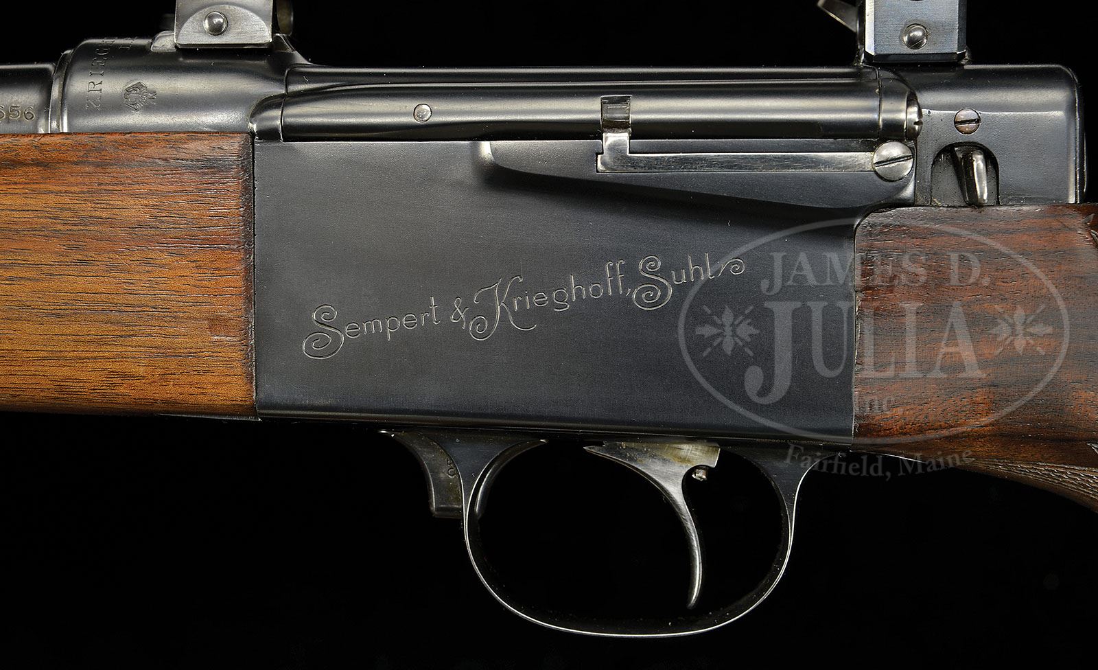 *◊ EXCEPTIONALLY RARE SEMPERT & KRIEGHOFF SEMI-AUTOMATIC RIFLE WITH SCOPE. SN 16628. Cal. 8 x 60. This very scarce gas operated rifle, appeared in the 1939 Stoeger catalog on p. 53, and retailed then at $500.00. It has 24-1/2″ round bbl, fitted with island base for one standing, one folding leaf U-notch rear sight, and front ramp housing silver bead. Rear portion of bbl is stamped with 1956 Ulm proofs for 8 x 60. Gas system is housed underneath front portion of bbl, a muzzle gas port operating a piston and push rod, actuating vertical sliding breechblock and separate reciprocating loader/extractor slider, that extracts/ejects empty cases and then strips cartridges from an internal single column 3 shot magazine loaded through hinged cover on top left side. Top of action is marked “KRIEGHOFF AUTOMAT” and “D. R. Pat. a.” around receiver ring and has integral Krieghoff scope mounts. Action is also fitted with single set trigger and sliding safety through front portion of trigger guard bow. Left side of action is engraved “Sempert & Krieghoff, Suhl”. Full capped pistol grip buttstock is of nicely figured and dark veined European walnut, and measures 15″ over 1/16″ thick ribbed horn buttplate. It features small right hand cheekpiece and point pattern checkering with line border. A sling loop is on toe line with another matching loop affixed to bbl/ gas system. Long removable matching forend has Deeley type release. Original Hensoldt DIASTA 4 x 32 scope with fine crosshair reticle is in Krieghoff Q-D mounts with windage adjustment in rear mount. Drop at heel: approx 2-9/16″, drop at comb: approx 1-9/16″. Weight with scope: 8 lbs. 4 oz. LOP: 15″. Copies of contemporary Krieghoff and Stoeger sales literature are included. PROVENANCE: Collection of Dr. Geoffrey Sturgess. CONDITION: Excellent, with only some slight silvering and some light dings and scratches in its very fine satin rust blue metal finish. Stocks retain nearly all of their orig rubbed oil finish with numerous light handling marks and a few deeper small dents. Bore is excellent. Action is smooth. Scope has a few minor marks, mostly on front bell. Optics are clear. This very rare weapon is notable as being the basis for development of Krieghoff’s entry to the Luftwaffe design competition for the FG42. 4-53227 MGM305 (6,000-9,000)