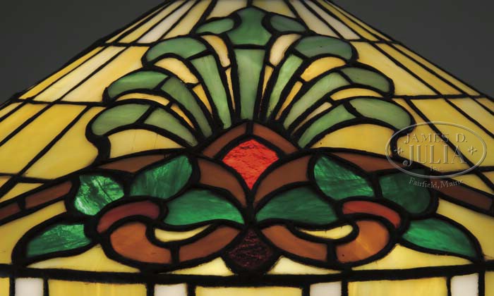 WILKINSON LEADED TABLE LAMP. Fully leaded shade with an art nouveau pattern in colors of green, red and pink set against a yellow rectangular geometric background. Shade is finished with a scalloped edge. Shade is supported by a very ornate base with a complementary art nouveau design and four large padded feet. Finishing the base are three sockets, three pull chains, vented heat cap and finial. A similar lamp may be found in the book Mosaic Shades Vol. II by Paul Crist, page 264 upper right. SIZE: Shade is 18″ dia. Lamp is 24″ t. CONDITION: Good with minor chips to leaded panels and has a few tight hairlines commensurate with age. Base is very good to excellent with sockets and pull chains being possible old replacements. 5-62198 (3,000-4,000)
