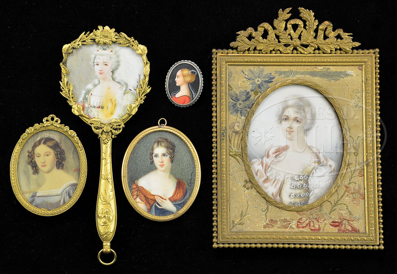 FIVE FRAMED MINIATURE PORTRAITS OF WOMEN. The lot consists of: 1) A 3-1/2″ x 2-3/4″ miniature oval portrait of a woman, signed illegibly on right side. Housed in a good brass rectangular frame. 2) A 2-3/4″ x 2-1/2″ miniature on ivory of a woman signed “SAINTEL”. Housed in a brass hand mirror (some loss to mirror backing and loose in mirror frame). 3) A 2-1/2″ x 2″ miniature on ivory of a woman signed “E. MELOCCHI” identified on reverse “COUNTESS PAOLINA BORGHESE”. 4) A 2-1/4″ x 1-3/4″ miniature signed “STIELER”. 5) A 1-1/4″ x 1″ small miniature of a woman with blonde hair and red dress. Unsigned. The locket marked “.800”. SIZE: As noted above. PROVENANCE: From a fine Augusta, Maine estate. CONDITION: Very good. 9-29325 (500-700)