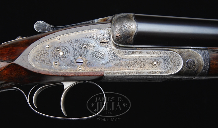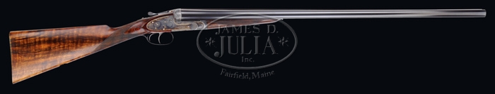 *FINE PURDEY DOUBLE BARREL SHOTGUN SN 23410. Cal. 12 ga. Wonderful Purdey with 30” Whitworth Steel bbls choked FULL/MOD with tapered concave smooth rib, sgl bead, ejectors, third fastener, dbl chopper lumps and dbl triggers. Rib has maker’s name & address with the “WHITWORTH STEEL” markings. Rib has a deep cartouche near breech end. It has standard Purdey sidelock receiver with cocked indicators, side clips and a thin raised rib around back radius of fences and it has assisted opening. Lockplates & receiver are beautifully engraved in standard Purdey patterns of very fine English rose & scroll patterns with bouquets of flower blossoms & maker’s name on each lockplate. Fences & bottom of receiver also have bouquets of flowers with another on forend iron. All appended metal is engraved to match and it has “SAFE” in gold on top tang. Mounted with very nicely figured, streaky, tiger striped French walnut with checkered splinter forearm & straight hand stock with raised teardrop side panels, 14-3/8” over a checkered butt. Accompanied by an early leather leg-o-mutton case containing a 1-pc ebony & brass cleaning rod with handle & a jag in a compartment inside lid. Inside forend iron is an engraved “2” signifying that this is the number “2” gun of a set. That explains the cartouche on the bbl rib and also an engraved pattern on opening lever. When set was separated, someone removed the numbers “2” from bbls and opening lever. Bore diameter: left – .732, right – .730. Bore restrictions: left – .045, right – .021. Wall thickness: left – .031, right – .029. Drop at heel: 2-1/8”, drop at comb: 1-1/2”. Weight: 7 lbs. 5.44 oz. CONDITION: Very fine. Bbls retain about all of their fine orig Purdey blue with only slight muzzle & breech end edge wear. Receiver & lockplates retain about all of their orig case colors, moderately faded on fences and bottom, strong & bright on lockplates and in sheltered areas on bottom of receiver. Opening lever & trigger guard with lower tang retain virtually all of their glossy bright blue. Cocked indicator on right lockplate also retains about all of its glossy bright blue. Wood is sound with a minor scratch or two with forearm retaining about all of its fine Purdey oil finish and buttstock retaining a fine, very high quality professionally restored finish from checkering back. Mechanics are crisp, brilliant shiny bores. Case shows heavy wear with repaired hinge and broken closure strap, missing shoulder strap with open seam in toe. 4-31618 JR488 (15,000-25,000)