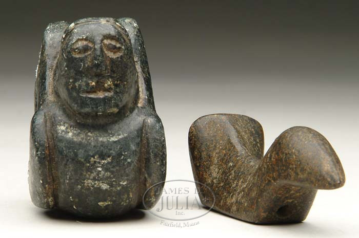 TWO STONE EFFIGY PIECES. One bird type stone 4” l x 1-1/2” h. Drilled for rawhide. Mississippian type human effigy pipe in black steatite. 2-3/4” sq. Unknown age. CONDITION: Good. 9-70322 (150-250)
