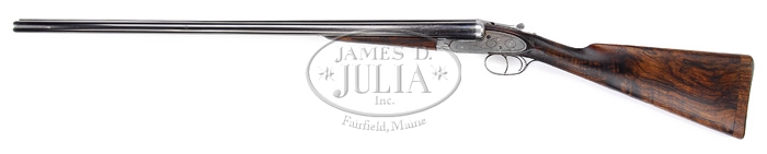 *FINE CASED PAIR OF PURDEY DOUBLE BARREL SHOTGUNS. SN 20167 & 20168. Cal. 12 ga. Lovely old cased pair of Purdeys with 30″ bbls choked identically FULL/IMP-CYL with tapered concave smooth ribs, sgl beads, ejectors, dbl chopper lumps, assisted opening & dbl triggers. They are nitro proofed 1-1/8 oz. and have 2-1/2″ chambers. Ribs are marked with maker’s name & address with a “1” and a “2” at breech ends which numbers also appear on opening levers & inside forend irons. They have usual 7-pin sidelocks engraved in standard Purdey English rose & scroll patterns with about 75-80% coverage. They have “SAFE” in gold on top tangs. Mounted with highly figured streaky French walnut with checkered splinter forearms & straight hand stocks, 15-5/8″ over checkered butts on wood extensions. Orig LOP is 14-7/8″. They each have a silver initial oval on bottom engraved “D.A.P.” Accompanied by an orig, Purdey, burgundy felt lined, brown leather motor case embossed on lid “D.A.P.” with orig maker’s label inside lid and a 2-pc brass & wood cleaning rod. Interior compartments contain a Holland & Holland pewter oil bottle & a nickled brass oil bottle, an ebony handled firing pin busing spanner with one broken tip and a variety of cleaning implements. #20167: Bore diameter: left – .738, right – .733. Bore restrictions: left – .027, right – .008. Wall thickness: left – .032, right – .032. #20168: Bore diameter: left – .733, right – .734. Bore restrictions: left – .027, right – .008. Wall thickness: left – .030, right – .026. Drop at heel: 1-7/8″, drop at comb: 1-3/8″. Weight with #20168 bbls: 6 lbs. 15.36 oz. CONDITION: Both shotguns are about very good. #20167: Bbls retain about 95% strong orig blue with thinning over forearm area and a few small scrapes with muzzle & breech end edge wear. #20168: Bbls retain about 90% strong orig blue, thinned over forearm area. Otherwise they have nearly identical wear with receivers & lockplates retaining traces of orig case colors having turned almost completely silver. Wood on both shotuns is sound showing extreme wear but having had great care with only minor nicks & scratches and a small gouge or bruise. Forearm on #20167 has strong checkering while #20168 is worn nearly smooth. Left ejector on #20168 is not working, although hammer cocks & fires, otherwise mechanics are fine, bright shiny bores. Case is extremely fine. 4-32585 JR288 (22,500-32,500)