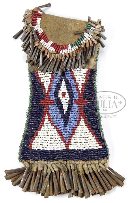 KIOWA STRIKE-A-LITE POUCH. Circa 1870. The harness leather pouch having a front side with colorful bead work in colors of deep blue, white, white heart red, green, and blue beads. The bottom flap fringe decorated with metal cones. SIZE: 7″ overall x 3-1/2″. CONDITION: Very good. 9-22924 (4,500-6,500)