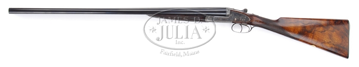 (Correction) Bore diameters currently read Left .627, right .629. These are incorrect. The bore diameters should read: Left .727, right .729. *CASED H.J. HUSSEY IMPERIAL EJECTOR DOUBLE BARREL SHOTGUN. SN 14216. Cal. 12 ga. Fine English Purdey look-alike with 28″ steel bbls, choked MOD/IMPCYL with tapered smooth, concave rib, sgl bead, ejectors & dbl underbites. Receiver has full sidelocks with gold lined cocked indicators with Purdey-style fences & dbl triggers. Receiver & lockplates are very beautifully engraved with English-style rose & scroll patterns with each lockplate having an extremely well detailed floral bouquet and maker’s name in a panel on each side. Bottom of receiver has model number. Trigger guard & all appended metal are engraved to match. Mounted with highly figured French walnut with checkered splinter forearm and straight stock with raised teardrop side panels & diamond shaped grip, 14-1/2″ over a checkered horn buttplate. Bottom of stock has a blank gold initial plate. Accompanied by its beautiful orig burgundy felt lined oak & leather trunk case with maker’s label & specification label inside lid. Outside of lid is embossed “O. AMES.”. Bottom is compartmented for shotgun & various parts. Bore diameter: left – .627, right – .629. Bore restrictions: left – .018, right – .002. Wall thickness: left – .028, right – .024. Drop at heel: 1-1/2″, drop at comb: 1-1/4″. Weight: 6 lbs. 9.28 oz. CONDITION: Very fine. Bbls retain virtually all of a fine professionally restored finish. Receiver & lockplates retain about all of their orig case colors with light wear around bottom edges. Wood is sound with minor nicks & dings with forearm showing moderate to heavy wear and retaining a dark hand worn patina. Stock with minor nicks & scratches retains a professionally restored finish. Mechanics are crisp, bright shiny bores. Case is very fine with moderate water damage with some leather covering missing on bottom. 4-31104 JR238 (7,500-12,500)