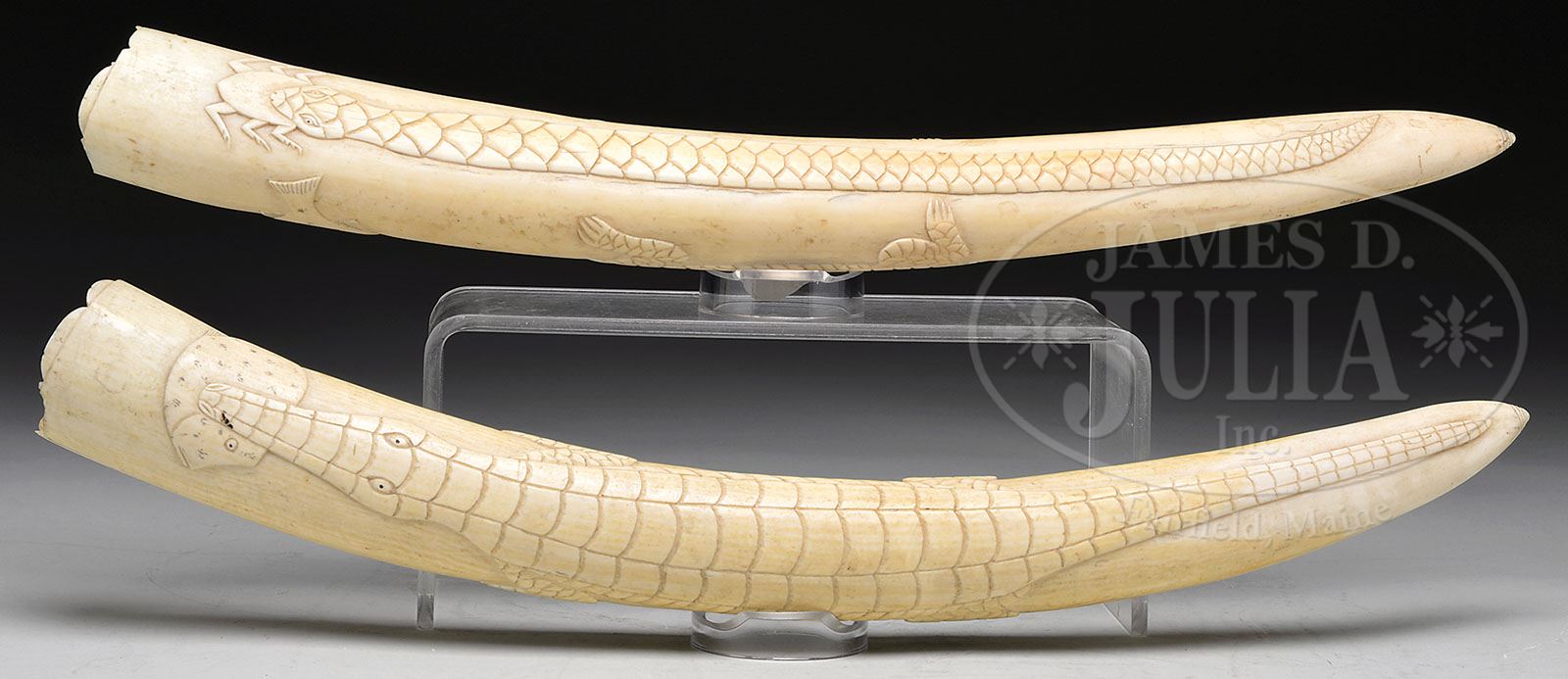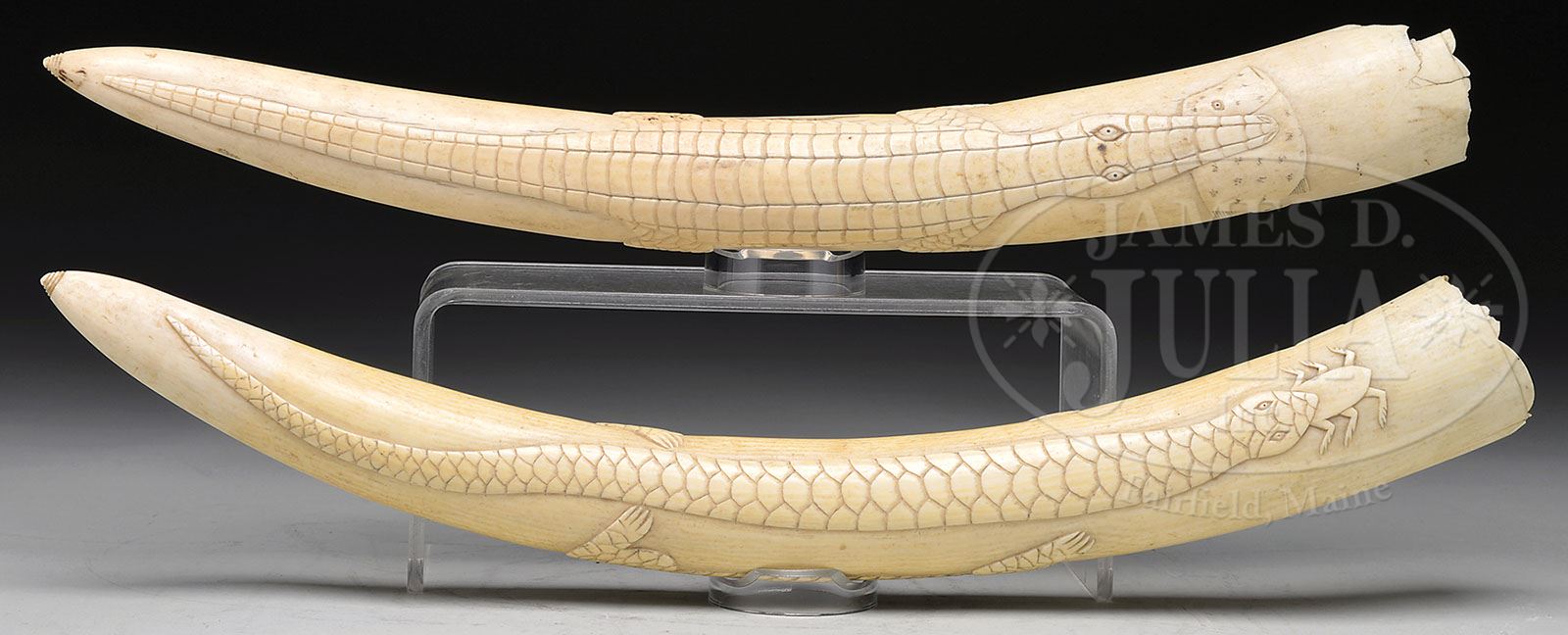 PAIR OF CARVED IVORY TUSKS. 19th century. Each depicting a crocodile eating a fish, the reverse carved with a serpent eating a bug. SIZE: Approximately 20″ l. CONDITION: With mellow patina, polished surfaces and light soiling. Good overall. Each tusk with roughness to base. 9-29819 (300-500)