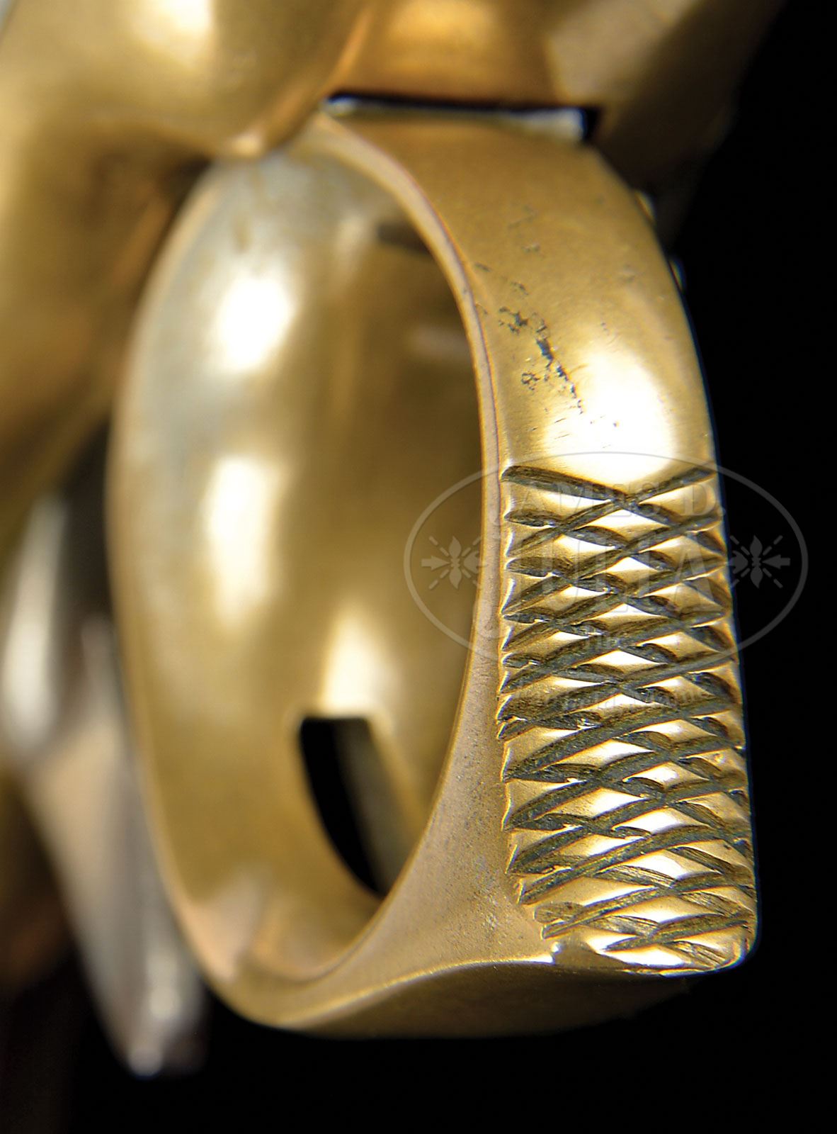 EXCEPTIONALLY RARE REIGER MANUAL REPEATING PISTOL M1889 WITH BRASS FRAME. SN NSN. Cal. 8mm. Repeating pistols were the immediate predecessors to semiautomatic arms. All required a manual movement, usually of the trigger, to chamber and discharge the cartridge. Sometimes both actions were performed sequentially, the firing pin falling as the action finally closed. In most cases, upon manual release, a loading bar or trigger lever would spring back to its original position. This Reiger repeater has a screw in 4 3/8″ bbl with a drift adjustable front sight and a ramped rear sight with a sliding blade. The pistol is entirely unmarked. Finger loop trigger and firing function are very similar to the Schulhof pistols. To access the cylindrical rotary magazine compartment, it was only necessary to move the right-side cover toward the rear. The cylindrical skeleton frame 6 cartridge clip (present) was simply dropped into the recess to load the pistol. The safety is mounted on the frame behind the bolt. Pushing the safety to the left blocks the bolt, preventing finger loop movement and bolt retraction. If already cocked, the safety will enter a notch in the protruding firing pin to block its movement. Moving the safety to the right allows unencumbered operation. The bbl and steel parts appear to have never been browned, blued or case hardened. Grips are nicely checkered with a thin border and secured with a single transverse screw. PROVENANCE: Dr. Geoffrey Sturgess Collection, “Vom Ursprung der Selbstladepistole” pages 102, 103. CONDITION: This entirely unmarked and unnumbered pistol was probably a tool room prototype as none of the steel parts seem to have been formally finished. They are presently grayed with superficial oxidation, most pronounced on the inserts in the left side of the frame. The brass of the frame has toned to a pleasing mustard patina. The bore is bright with very sharp rifling and minimal oxidation. Mechanically perfect. An extremely rare repeater, certainly the first ever examined by this reviewer. 4-52437 LMA113 (20,000-30,000)