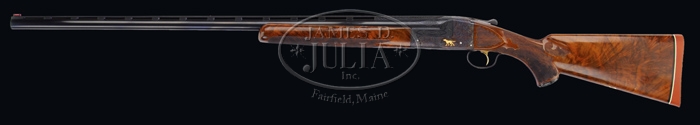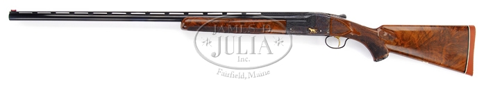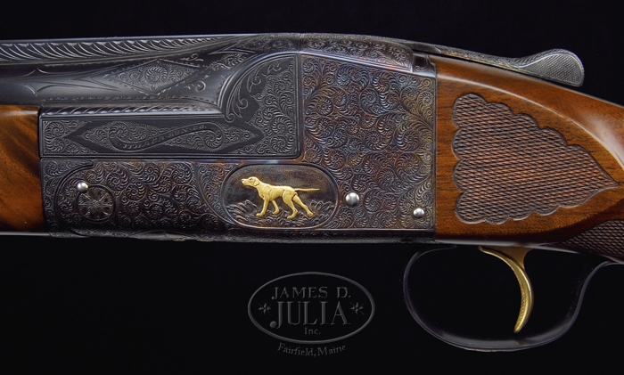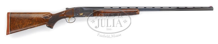 *VERY RARE ITHACA KNICK MODEL SOUSA GRADE SINGLE BARREL TRAP GUN. SN 401036. Cal. 12 ga. Named after famous composer who was a well known celebrity trap shooter, this beautiful shotgun has 32″ bbl choked FULL with flat tapered matted ventilated rib with Ray-Bar front sight & ivory middle bead. It has side reinforcements engraved “ITHACA GUN CO.” on left and “ITHACA N.Y. U.S.A.” on right with dbl bite extensions & ejector. Receiver is spectacularly engraved with vignettes of a deep relief raised gold pointer on left side, a deep relief raised gold setter on right side, both in field scenes and a deep relief raised gold duck over water with marsh grass in foreground. Trigger guard has Sousa grade logo of a deep relief raised gold nude mermaid, all surrounded by extremely fine foliate arabesque patterns. Engraving extends over bbl reinforcements and about 4″ up bbl and about 5″ on sides of rib. It has checkered gold plated trigger. Mounted with extremely beautiful feather crotch & shell grain American walnut with Ithaca’s trademark black insert carved & checkered, tapered target forearm and extensively carved & checkered pistol grip buttstock with scalloped carved & checkered raised side panels, 14-1/2″ over a presentation model Pachmayr Whiteline pad. It has a fluted horn grip cap & a blank gold initial shield on bottom. Water table has serial number along with “SOUSA 12″. These famous shotguns were used for many years beginning in the early 1900’s and are still being used to great effect. Such luminaries as John Phillip Sousa, Annie Oakley & many others also used them in competition & exhibitions. Accompanied by a Pedersen gold fleece lined, brown vinyl case. Bore diameter: 731. Bore restrictions: .040. Wall thickness: .035. Drop at heel: 1-1/8″, drop at comb: 1-1/8”. Weight: 8 lbs. 5.44 oz. CONDITION: Extremely fine plus. Bbl retains virtually all of its clean bright rust blue and receiver all of its strong brilliant case colors. Water table & standing breech have fine, light nicks & dings with case colors down in them, however it does not appear to have been refinished as engraving & gold are crisp with their orig fine details. Trigger guard retains all of its strong bright blue. Wood is sound with a couple of minor nicks & scratches & retains about all of its fine orig finish. Mechanics are crisp, brilliant shiny bore. Case is fine. 4-32895 JR297 (20,000-25,000)