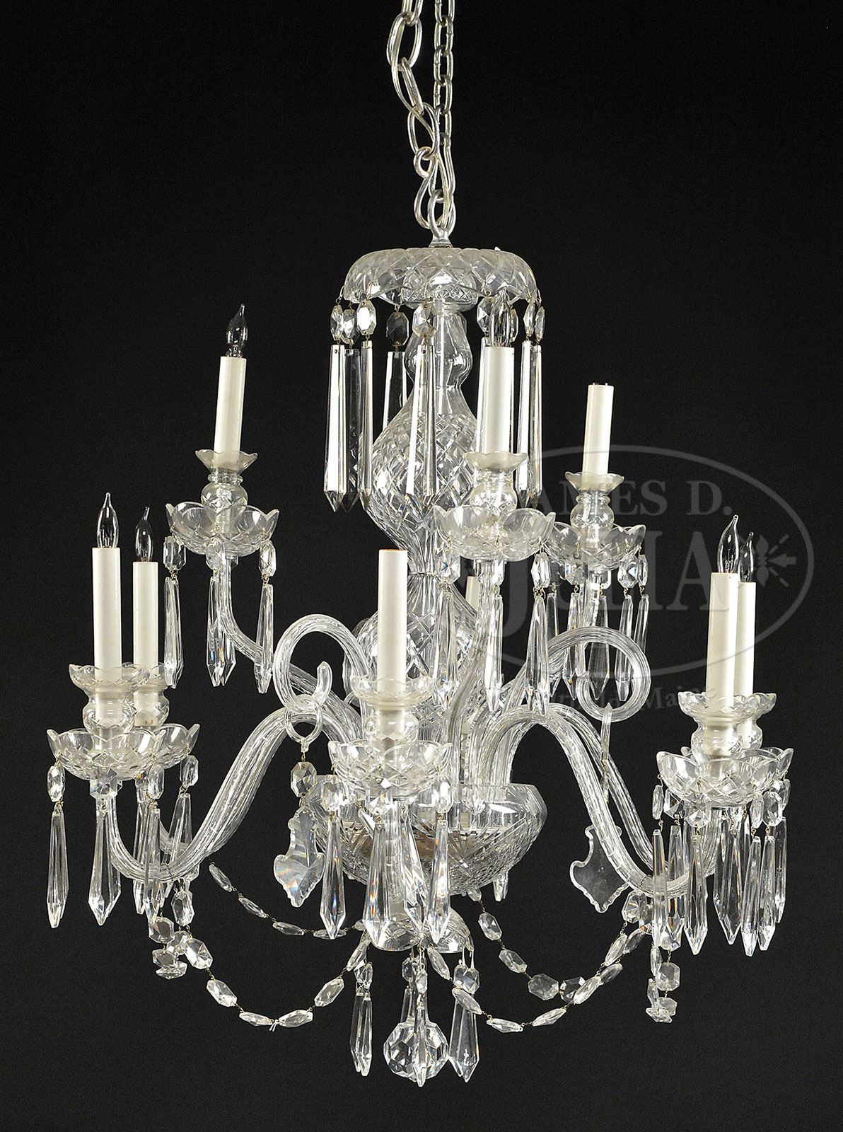 OUTSTANDING SIGNED WATERFORD CRYSTAL NINE BRANCH CUT GLASS CHANDELIER. 20th century. All major glass piece signed “Waterford”. The central shaft having elongated balls leading to a bowl-shaped hub holding six horizontal S-shaped arms and three vertical S-shaped arms, hanging prisms off bobeches and leading to two-tier candle cup with light fixture, extra prisms dangled off inverted bowl at top and bottom of shaft. SIZE: To top of hanging rim: 32″, Diameter” 30″ CONDITION: Very good. 9-90022 (2,000-4,000)